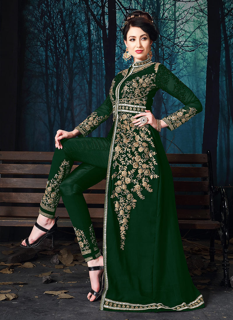 Dark Green Slit Style Embroidered Anarkali Pant Suit is indian wear featuring embroidery work with zari, thread and stone detail on it georgette slit style top paired with patch embroidered santoon bottom and lining and satin bordered chiffon dupatta. This designer set will surely fetch you compliments for you glamorous sense of style. Team it up with statement jewellery and fancy clutch to look mesmerising.