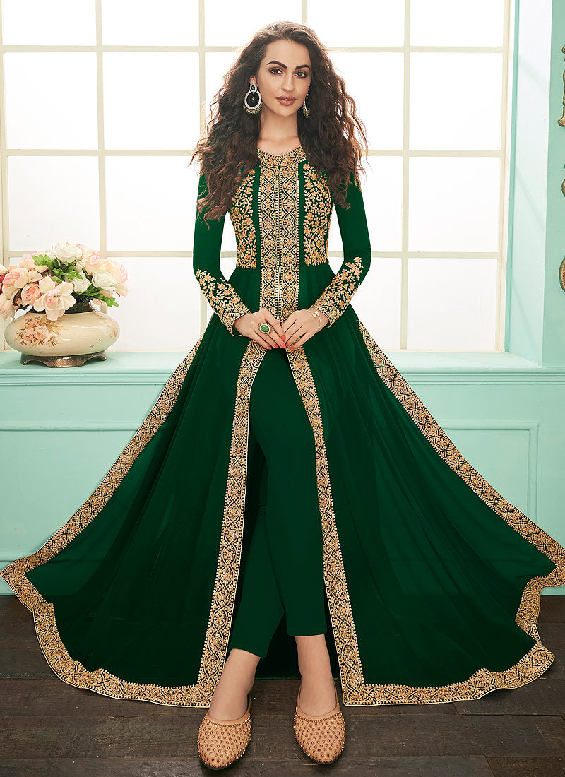 Dark Green Slit Style Embroidered Anarkali Suit is indian wear designed for festival or wedding parties. This outfit features ethnic embroidery work with zari, thread and stone detail on georgette anarkali top paired with santoon silk pants bottom inner and satin lace bordered chiffon dupatta. This set will surely fetch you compliments for you glamorous sense of style. Team it up with golden jewellery and fancy clutch to look mesmerising.