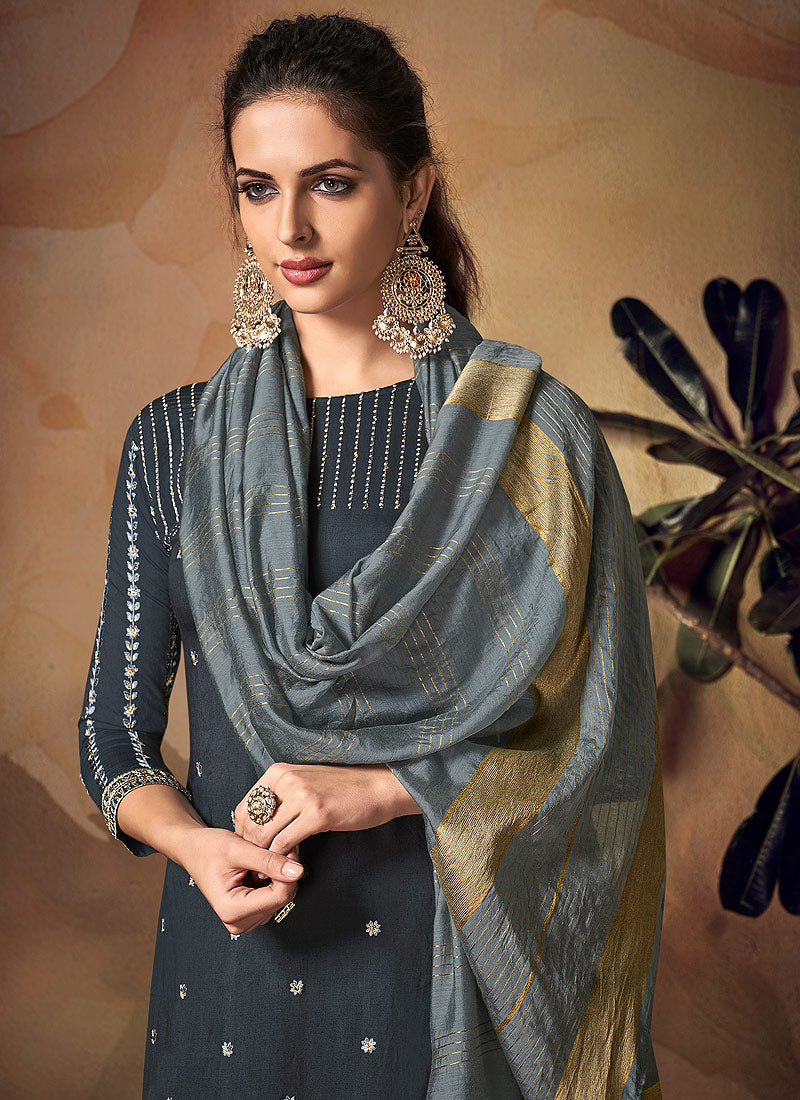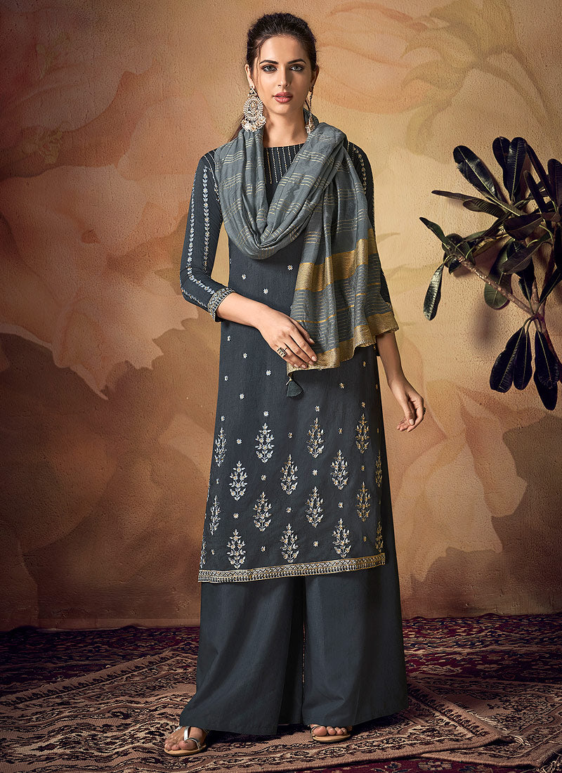 Deep Grey Zari Embroidered Palazzo Suit is specially designed to complement your alluring beauty. This indian outfit comprises a beautiful traditional resham zari and thread embroidered on straight cut banarasi jacquard top paired with santoon palazzos pant bottom and inner and golden zari detailed banarasi silk dupatta. This suit set will go well with fancy golden jewellery and heels.