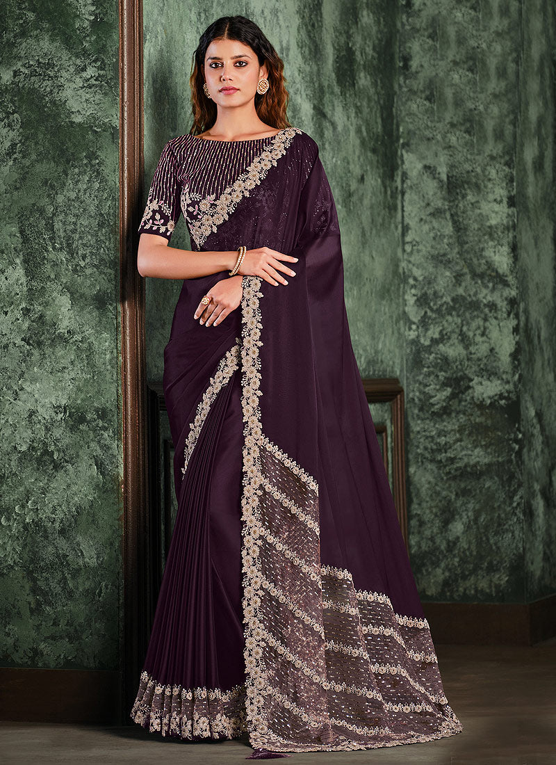 Deep Purple Multi Embroidered Designer Saree is perfect for all the festive and wedding parties. This saree has unique and intricate resham, zari, beads and sequence embroidery detail with ethnic motifs all over pallu and daman on heavy organza silk fabric paired with equally embellished subtle silk blouse. Drape this pretty saree on desi events with heels and jewellery to look like a diva.