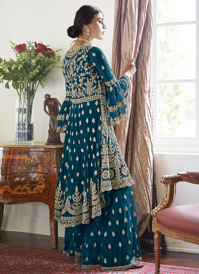 Dusky Blue Beige Multi Embroidered Designer Gharara Suit