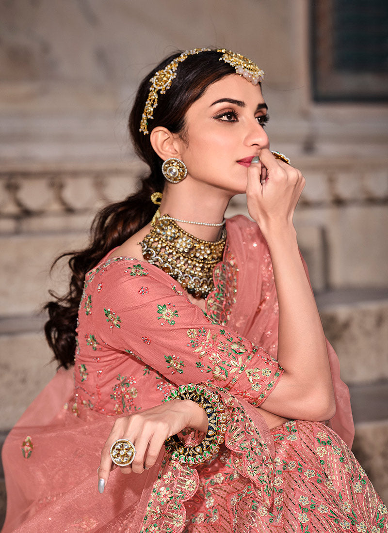 Dusky Pink Multi Embroidered Traditional Lehenga Choli Shop Latest Indian Clothes For Eid 2022 In USA UK Canada Germany Free International Shipping. will make you look more beautiful on this wedding season with indian ethnic essence. This set comprises of traditional zari, resham dori and sequence embroidery work on soft net choli paired with all over equally embellished soft net lehenga with santoon lining. The beauty part is it’s border and butti embroidered soft net dupatta. Style this set with heels and golden jewellery to look stunning with all bridal drama.