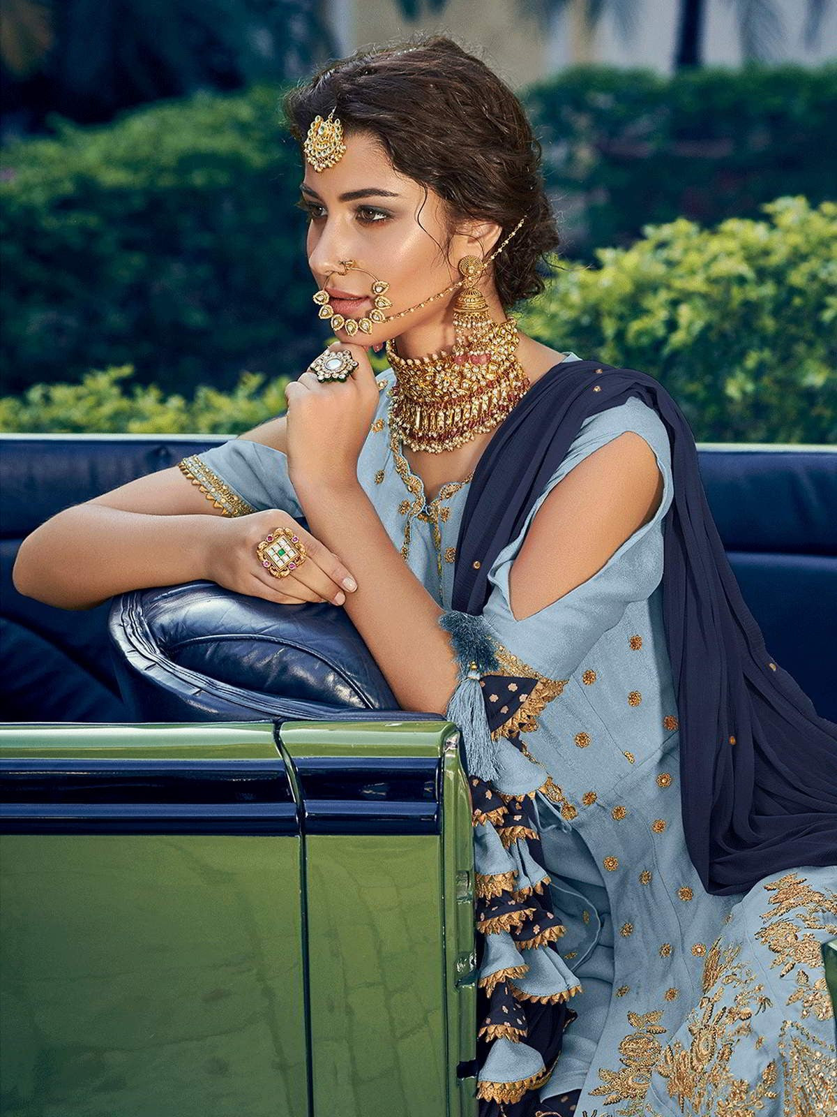 Firozi and Blue Embellished Gharara Suit will mesmerise rest of the crowd with your ethereal ethnic glow by wearing this set with beautiful top fully embellished with zari buttis and resham kari embroidery work on satin georgette fabric paired with embroidered georgette gharara bottom with added lining and zari lace and butti detailed georgette dupatta. This set can be teamed up with a pair of golden heels and traditional jhumkas.