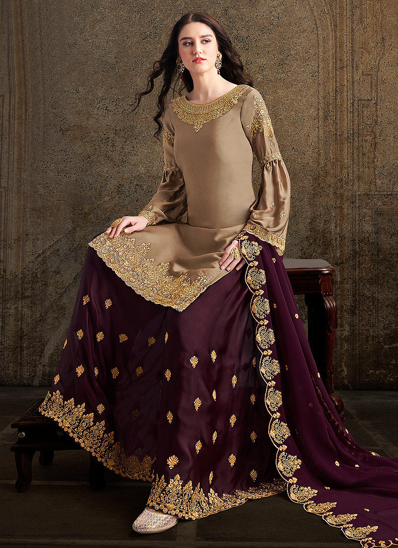 Golden And Maroon Designer Sharara Suit In usa uk canada. Shop Latest Indian Clothes Collection Of Golden And Maroon Designer Sharara Suit Online In Australia, Newzeland. This set has all the ethnic hues of zari, resham thread and stone embroidery work on its soft satin top paired with embellished satin palazzo bottom and santoon inner. This set accompanies minimalist embroidered georgette dupatta. Wear this with a pair of heels and golden jewellery to have that desi look.