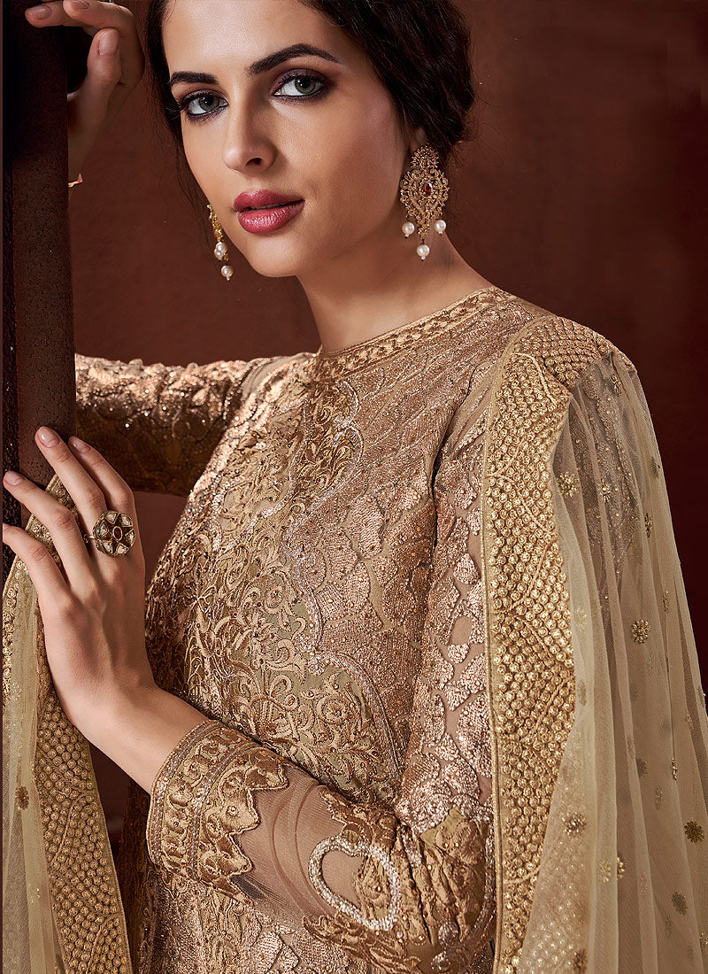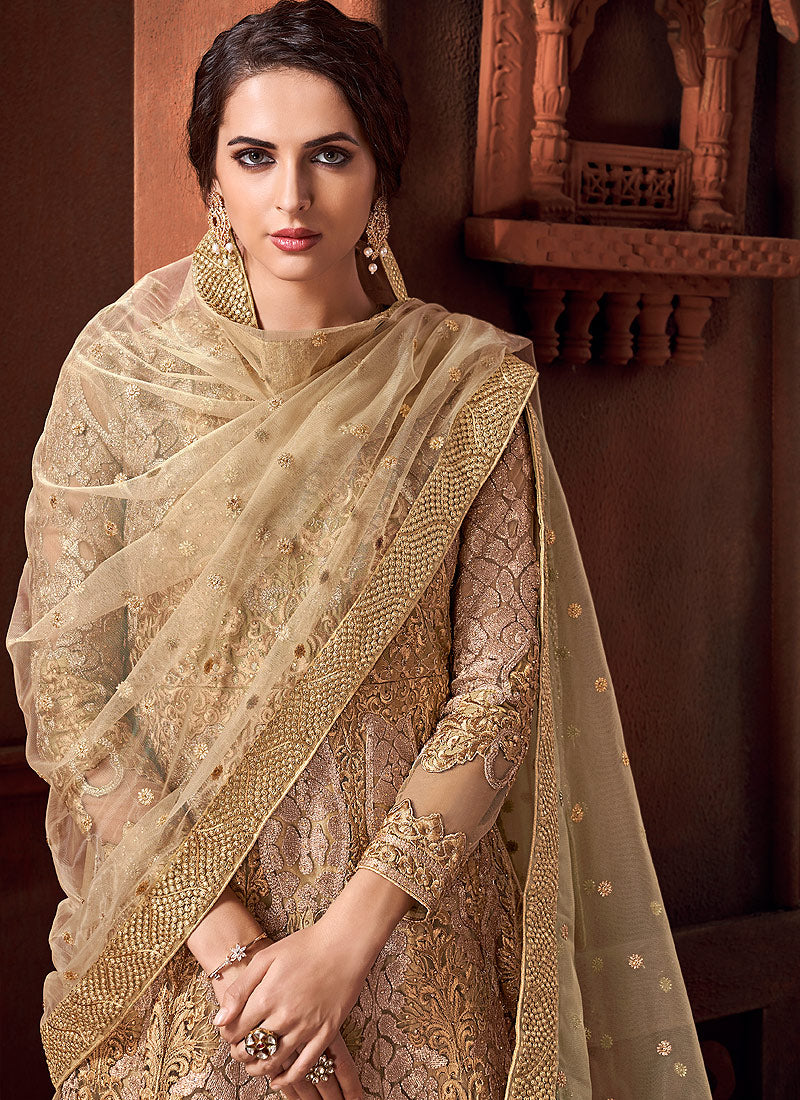 Golden Beige Embroidered Anarkali Suit will bring out the best in you on any wedding or festive event with its exclusive karigiri. This suit set features traditional zari, thread and badla embroidery on fancy fabric anarkali top paired with classic santoon bottom and inner. The beauty part of this suit is its embellished net dupatta. Team up golden jewellery and stilettos with this suit set to fetch you a lots of compliments and glances.