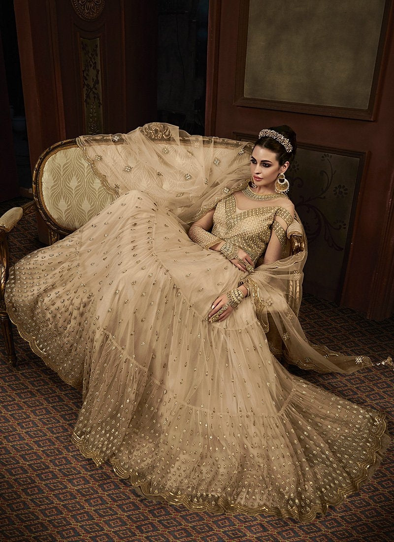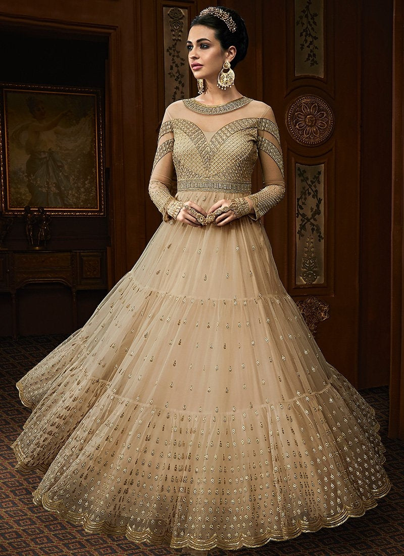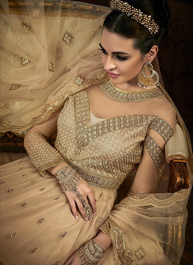 Golden Overall Embroidered Net Anarkali Suit is designed with absolute perfection to rock any festive occasion or wedding parties. This set features intricately embossed embroidery work with zari, thread and stone detail on it satin georgette anarkali top paired with santoon bottom and lining and zari embellished net dupatta. This designer set will surely fetch you compliments for you glamorous sense of style. Team it up with statement jewellery and fancy clutch to look mesmerising.