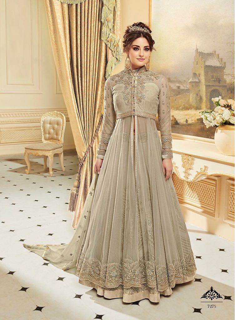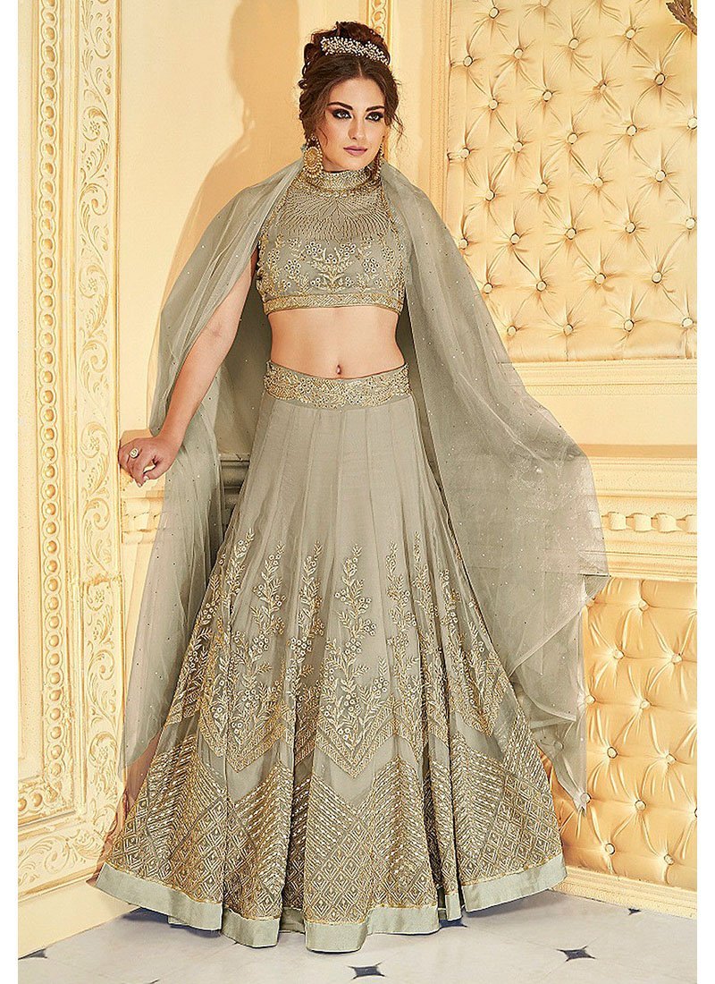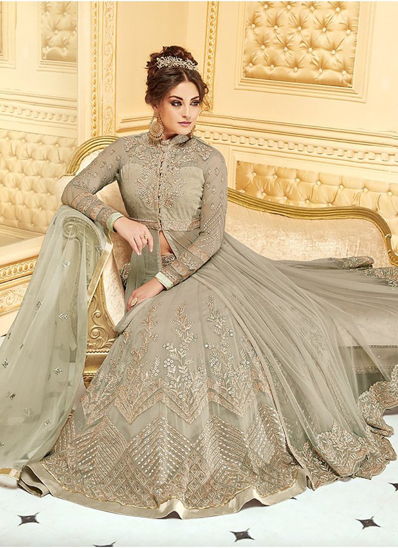 Grayish Beige Net Designer Anarkali Lehenga Suit In usa uk canada Shop Latest Indian Clothes Collection Of Grayish Beige Net Designer Anarkali Lehenga Suit Online In Australia, Newzeland. This set features designer zari, thread and crystal stone embroidery on soft net anarkali top paired with foil print detailed silk lehenga bottom and santoon inner. The beauty part of this suit is its lace and latkan embellished net dupatta. Team up golden jewellery and stilettos with this set to have a stunning wedding look.