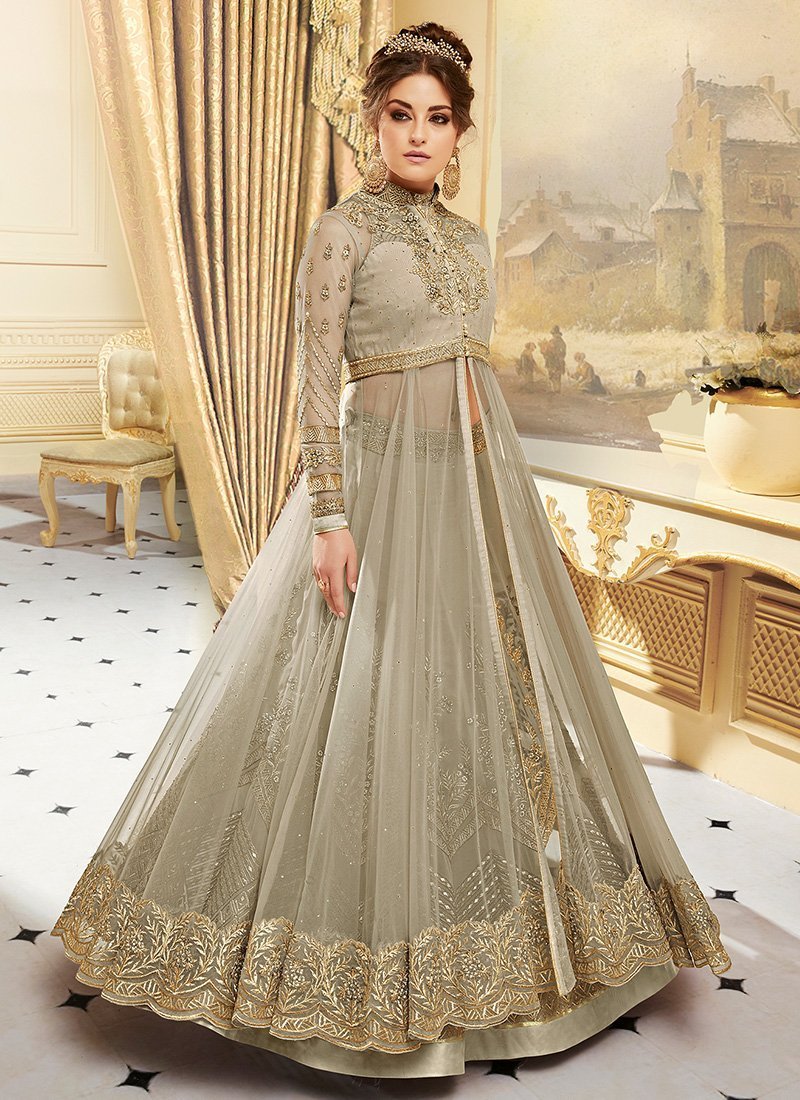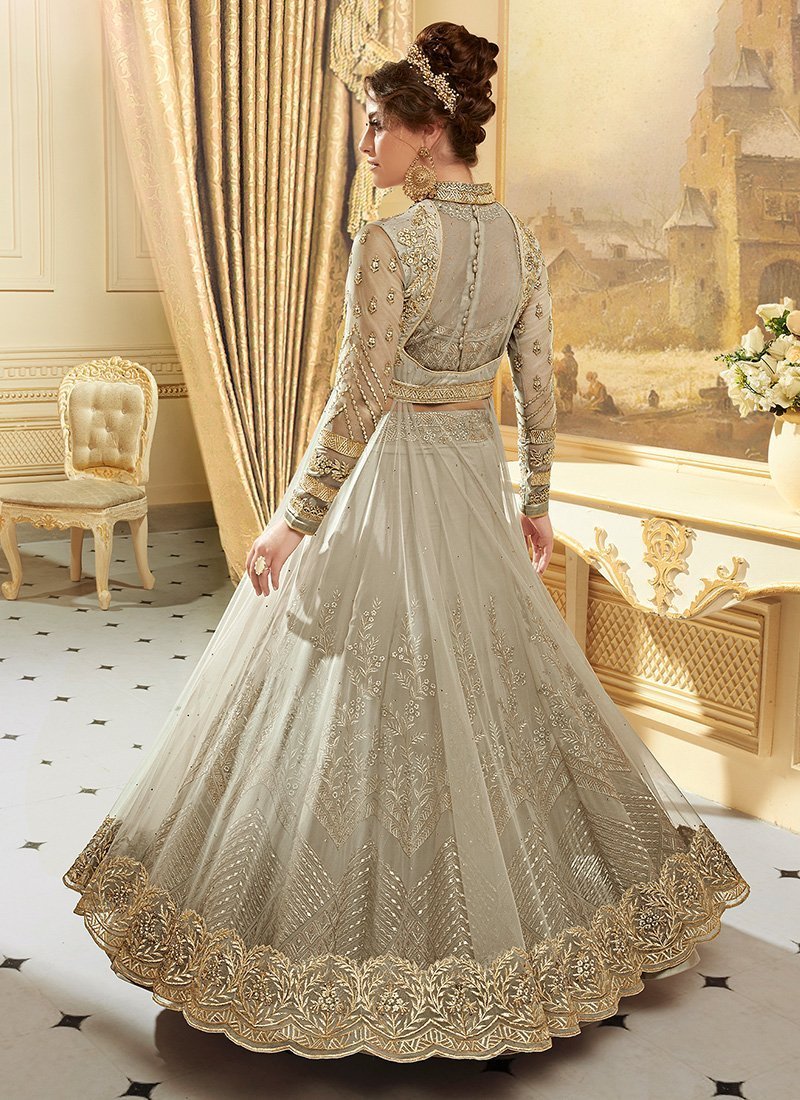 Grayish Beige Net Designer Anarkali Lehenga Suit