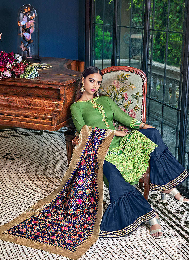 Green And Blue Silk Palazzo Pant Suit is specially designed to complement your ethnic look. This indian outfit comprises a traditional resham zari and thread khatli embroidery work on straight cut satin silk top paired with embellished fancy palazzos pant bottom and santoon inner. The beauty of this suit is its exclusive zari embellished jacquard dupatta. This suit set will go well with golden jewellery and heels.