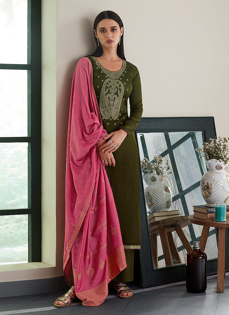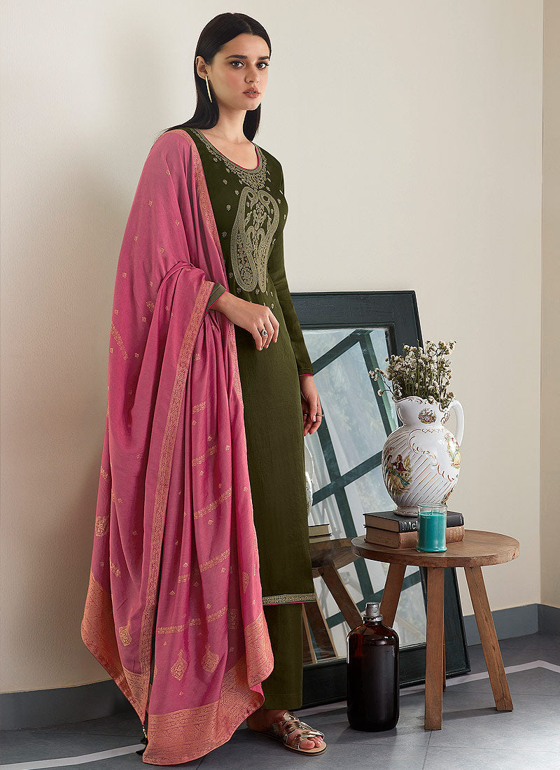Green And Pink Embroidered Pant Style Suit In usa uk canada Shop Latest Indian Dress Collection Of Green And Pink Embroidered Pant Style Suit Online In Australia, Newzeland especially crafted to make you look glammed up with its mukaish work embroidery in combination of zari, resham and stone work annotated perfectly on straight cut uniquely designed premium silk top paired with solid jam satin pants bottom. This set also accompanies zari work enhanced viscose jacquard dupatta. Style it gracefully with studded earrings and stylish heels.