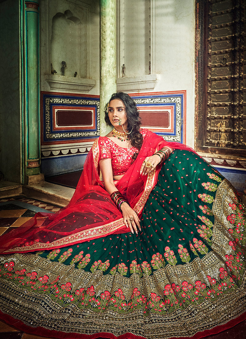 Green And Red Designer Lehenga Choli In usa uk canada. Shop Latest Indian Clothes Collection Of Green And Red Designer Lehenga Choli Online In Australia, Newzeland. This elegant set has a very pretty thread embroidery detailed with zarkan, zari and sequence work on soft net lehenga with satin lining paired with equally embellished soft net choli and ethnic embroidery bordered net dupatta. Team this beautiful attire with classic pair of heels and golden jewellery to look like a diva.