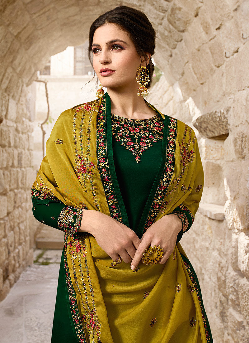 Green And Yellow Traditional Pants Suit features indian wear with elegant and stylish look for desi weddings. This set has all the traditional hues zari, stone and thread work annotated perfectly on its sarin georgette top paired with santoon bottom and inner. The unique part is it’s exclusive cut embroidered chinon crepe dupatta. Wear this with a pair of heels and traditional jewellery to have a desi girl look.
