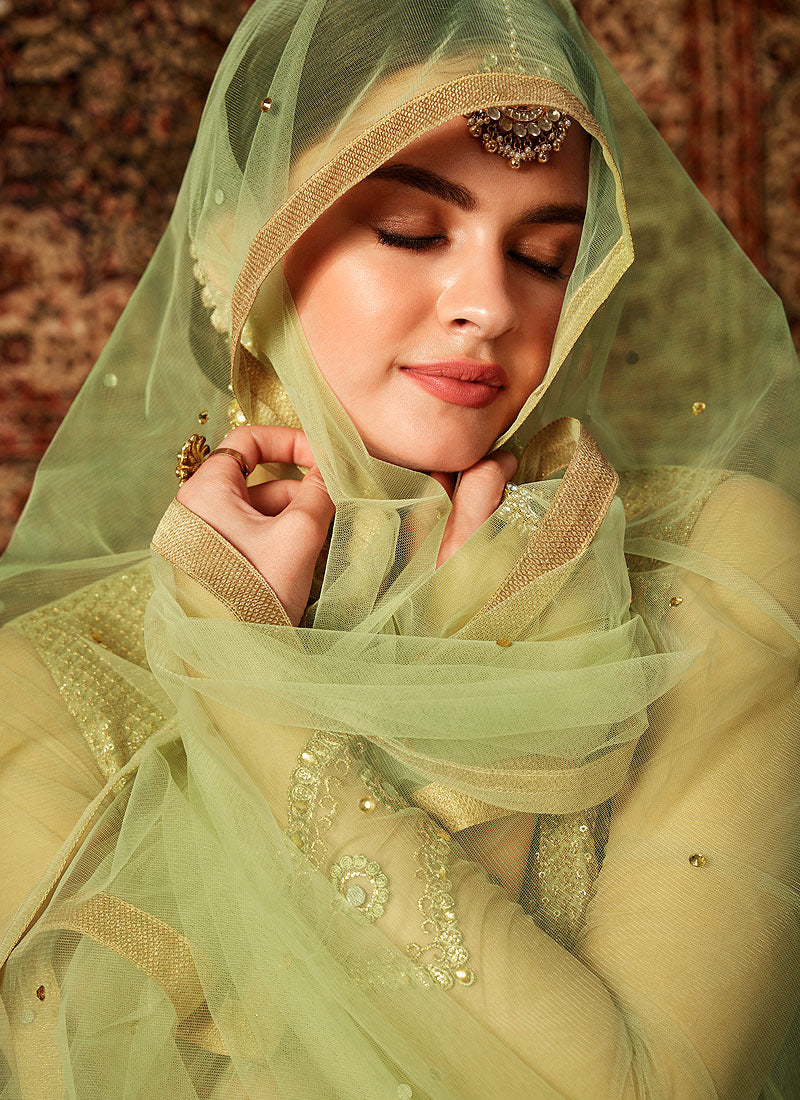 Green Bunch Embroidered Pakistani Pants Suit is pakistani style suit with elegant and stylish look to style on wedding events. This set has all the traditional hues of zari, tread and multi embroidery karigiri on its soft net top paired with banarasi silk embroidered pants bottom and inner. The unique part is it’s exclusive satin bordered net dupatta. Wear this with a pair of heels and golden jewellery to have a desi girl look.