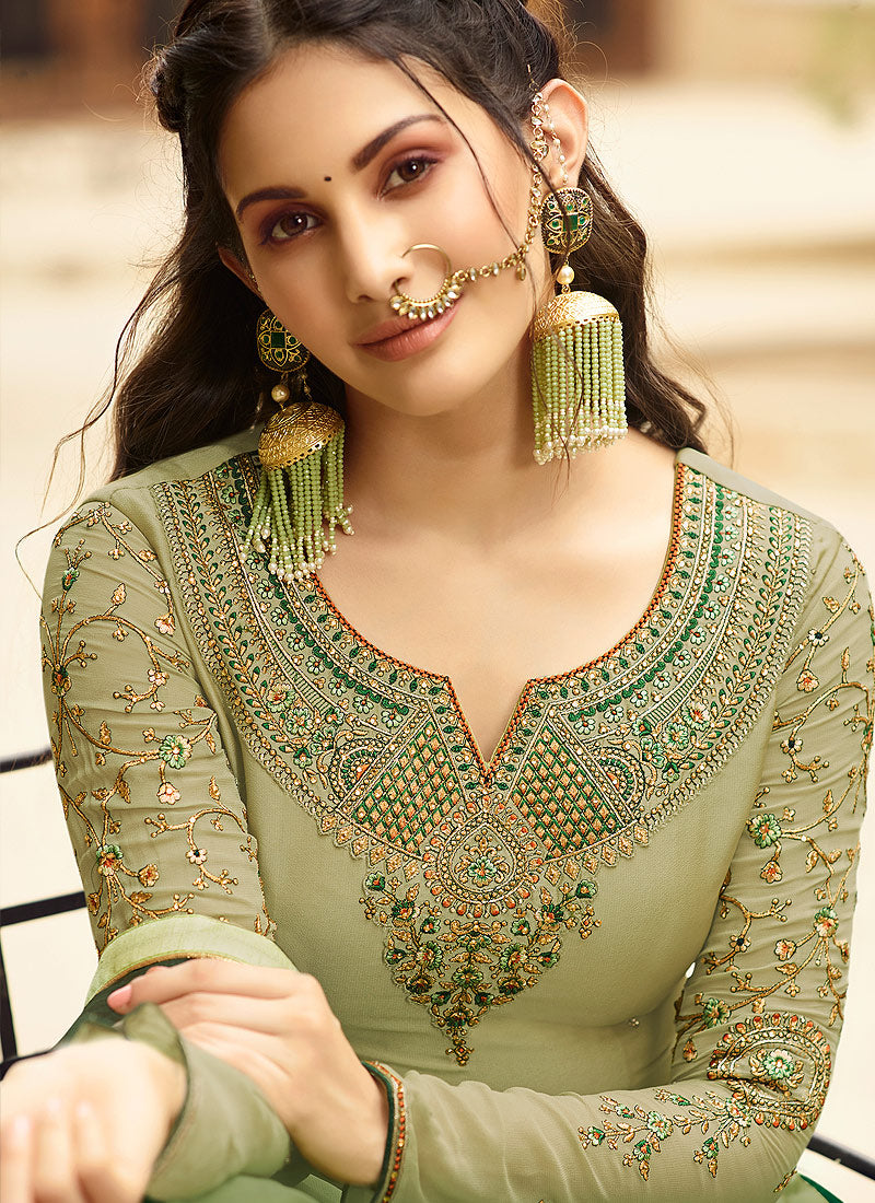 Green Dual Tone Zari Embroidered Designer Sharara Suit is indian wear Green Sharara Suit suitable to style with all elegance in any desi event. This set has all the ethnic hues of zari, resham thread and stone embroidery work on its satin georgette top paired with embellished georgette gharara bottom and santoon inner. This set accompanies minimalist embroidered chiffon dupatta. Wear this with a pair of heels and golden jewellery to have that desi look.