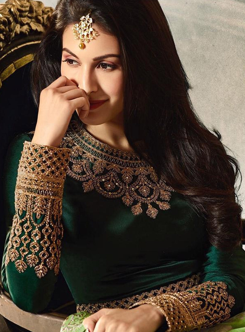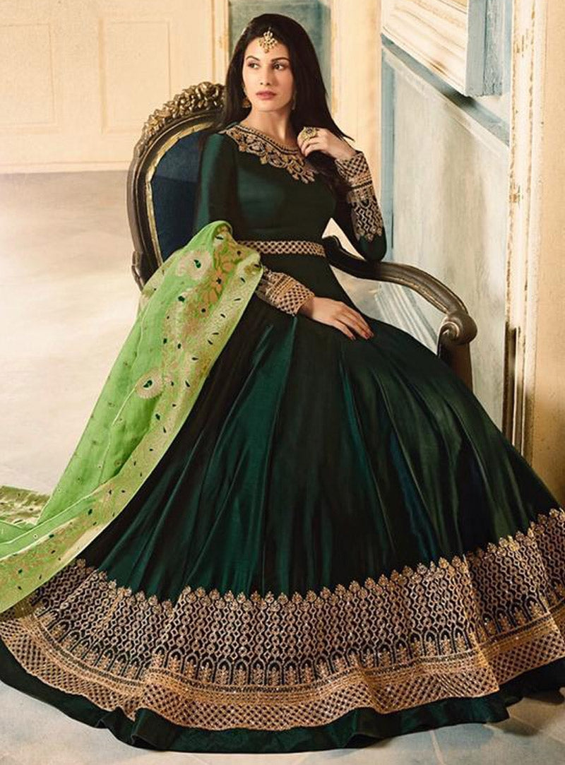 Green Dual Tone Motif Embroidered Ghera Anarkali Suit is especially crafted for showcasing glamorous style and ethnic elegance with its unique motifs embroidered combination of beautiful zari and thread work annotated perfectly on flared satin georgette anarkali top with border detail. This set accompanies with santoon bottom and digital printed banasi jacquard dupatta. Style it gracefully with studded earrings and stylish heels on this festive season.