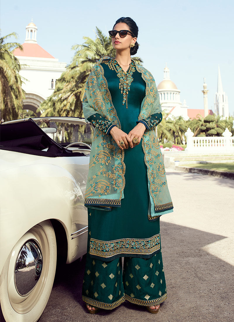 Green Embroidered Palazzo Suit festures palazzos pant suit with elegant and stylish look for indian weddings. This set has all the traditional hues of stone, zari and thread work done on its satin georgette top paired with viscose jacquard bottom and santoon inner. The unique part is it’s zari embellished georgette dupatta. Wear this with a pair of heels and golden jewellery to have a desi girl look.