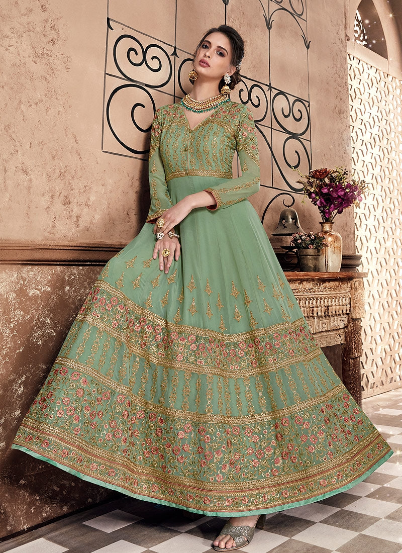 Green Glam Multi Embroidered Flared Anarkali Suit is specifically designed to make you look perfect for wedding event or any festive occasions. This suit set features traditional floral butti work of zari and resham thread embroidered on fancy georgette top with santoon inner paired with dull santoon bottom and bordered chiffon dupatta. Team this suit with stilettos and statement jewellery to complete your look.