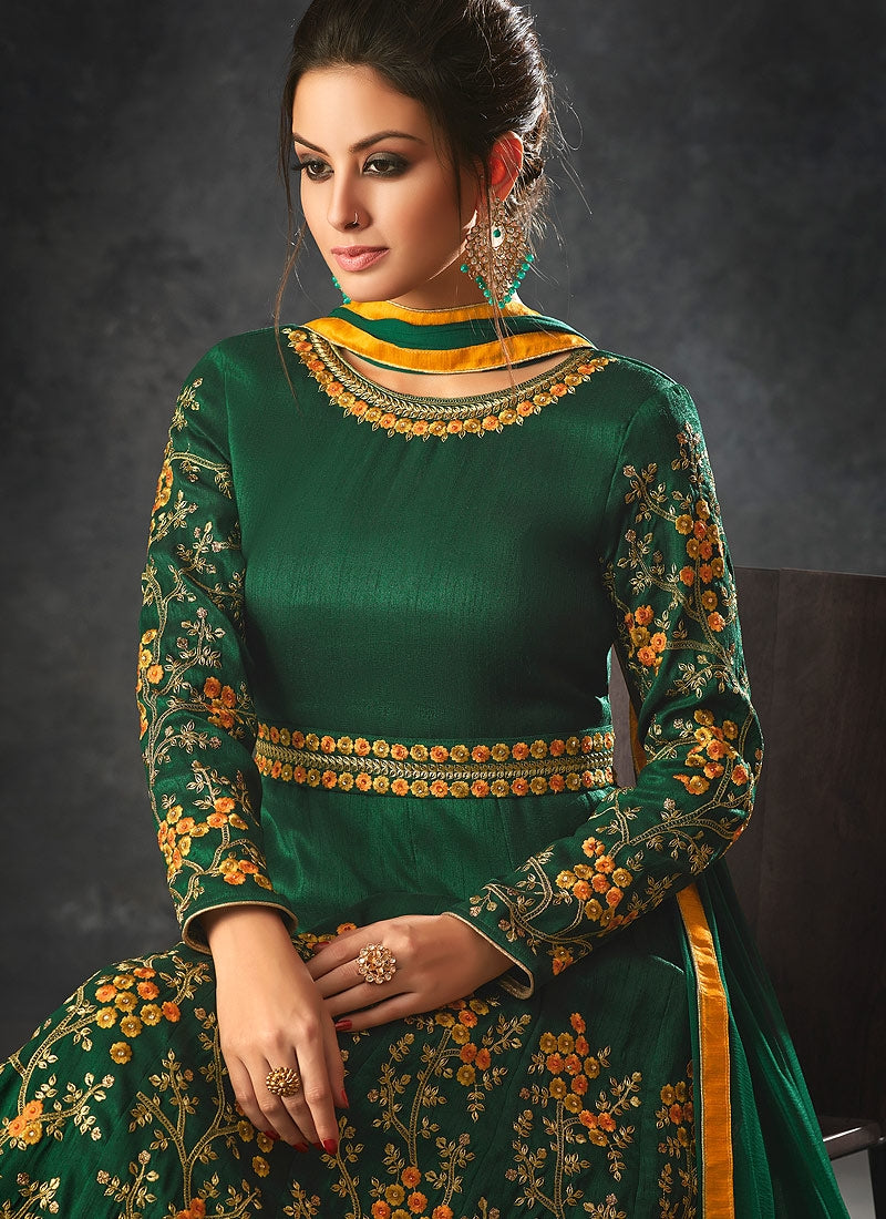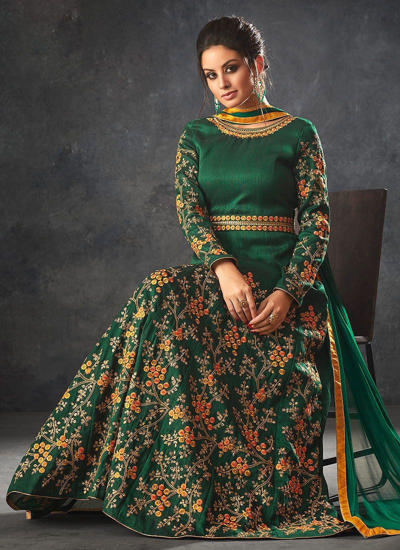 Green Glam With Floral Embroidered Flared Anarkali Suit is specifically designed to make you look perfect for wedding event or any festive occasions. This suit set features floral embroidery work of zari and resham thread embroidered on fancy raw silk top with fussing santoon inner detail paired with santoon bottom and butti detailed chiffon dupatta. Team this suit with stilettos and statement jewellery to complete your look.