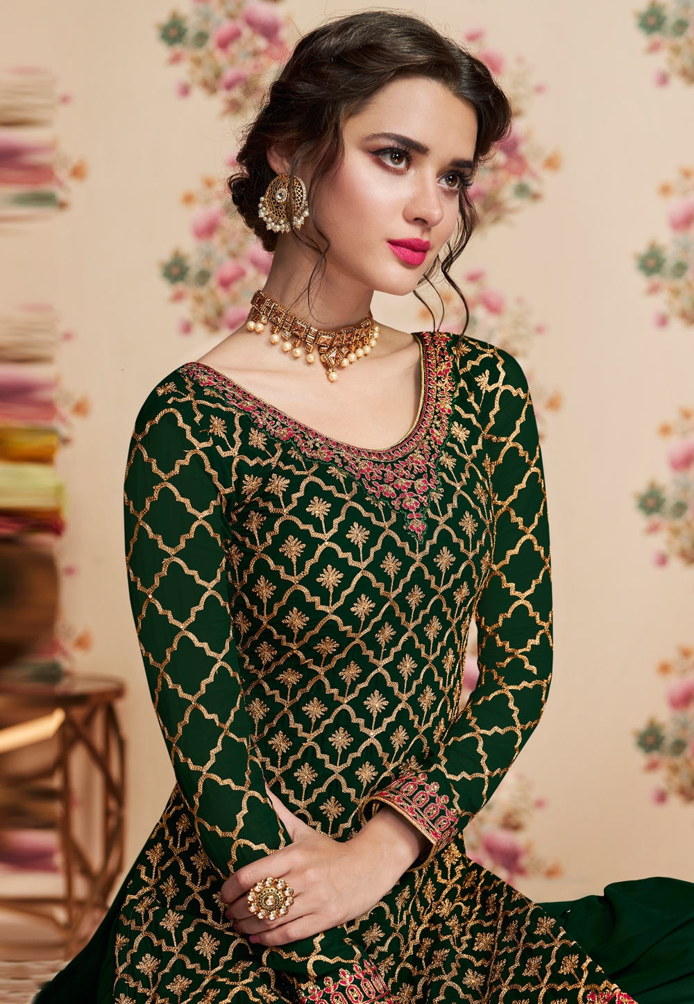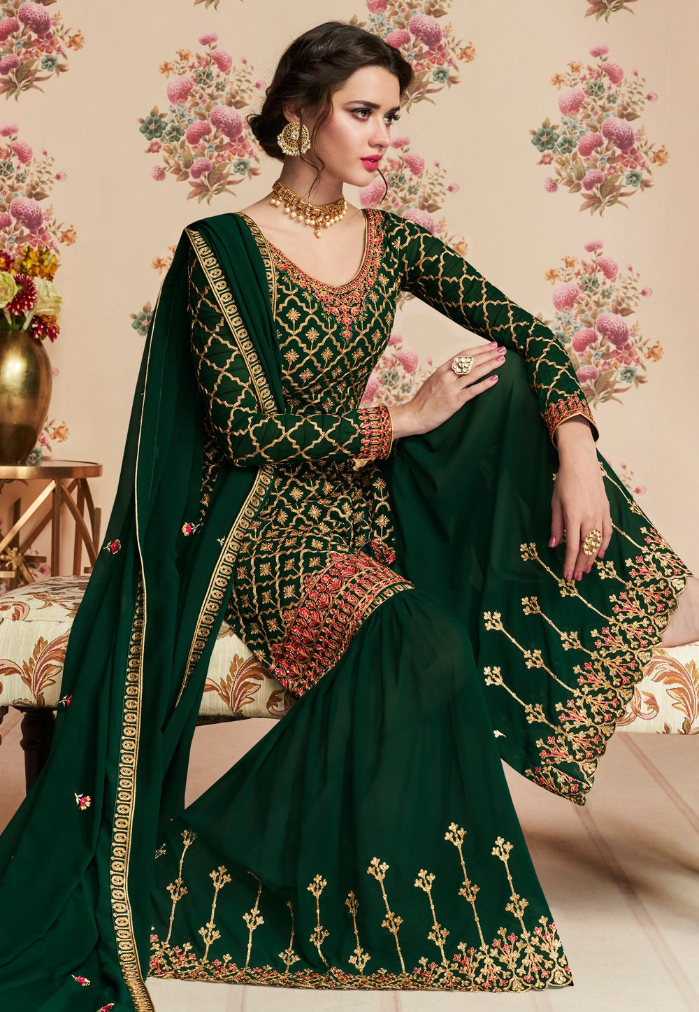 Green Overall Embroidered Gharara Palazzo Suit features a beautiful designer georgette top with delicate traditional embroidery with zari and resham machine work that goes amazingly with the hues of the dress. This set is paired with georgette bottom and satin inner and equally fascinating georgette dupatta. Team this beautiful attire with classic pair of heels and matching jewellery to look like a diva on this festival season or on any Wedding event.