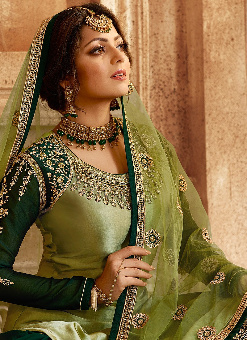 Green Two Tone Dual Bottom Lehenga/Pant Kurti Set is especially crafted for showcasing glamorous style and ethnic elegance with its unique embroidered combination of zari and resham thread work annotated perfectly on straight cut satin georgette top with santoon lining and flared georgette layered embroidered lehengha. This set also accompanies with matching santoon pant bottom and embroidered cut work net dupatta. Style it gracefully with studded earrings and stylish heels.