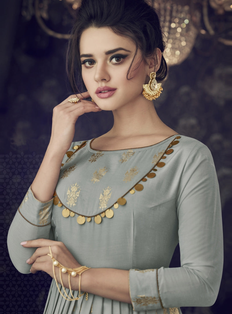 Grey And Golden Embroidered Flared Anarkali Suit is especially crafted for showcasing glamorous style and ethnic elegance with its unique embroidered combination of zari and resham thread work annotated perfectly on flared muslin silk with foil printed top. This set accompanies with matching santoon bottom and bordered nazmine chiffon dupatta. Style it gracefully with studded earrings and stylish heels.