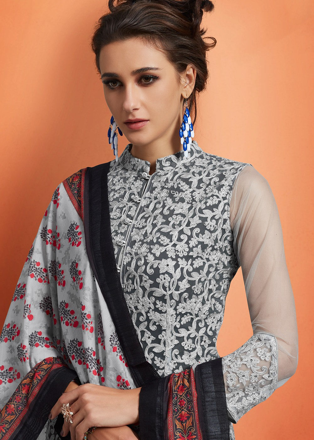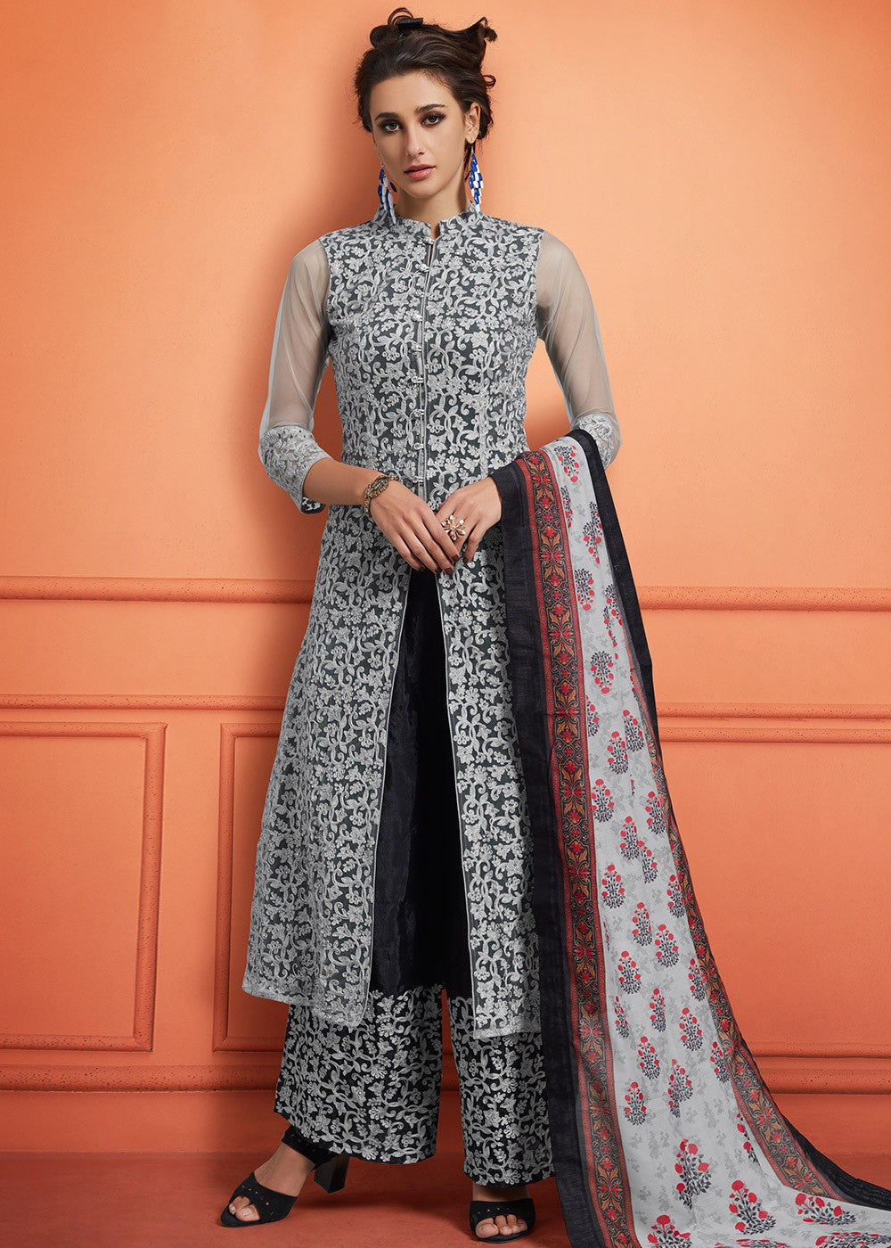 Black And White Floral Embroidered Palazzo Suit is especially crafted to make you look glammed up with its floral embroidered combination of zari, resham and stone work annotated perfectly on round cut uniquely designed muslin top with solid muslin palazzo bottom with detailing. This set also accompanies contrasting digital print enhanced dupatta. Style it gracefully with studded earrings and stylish heels.