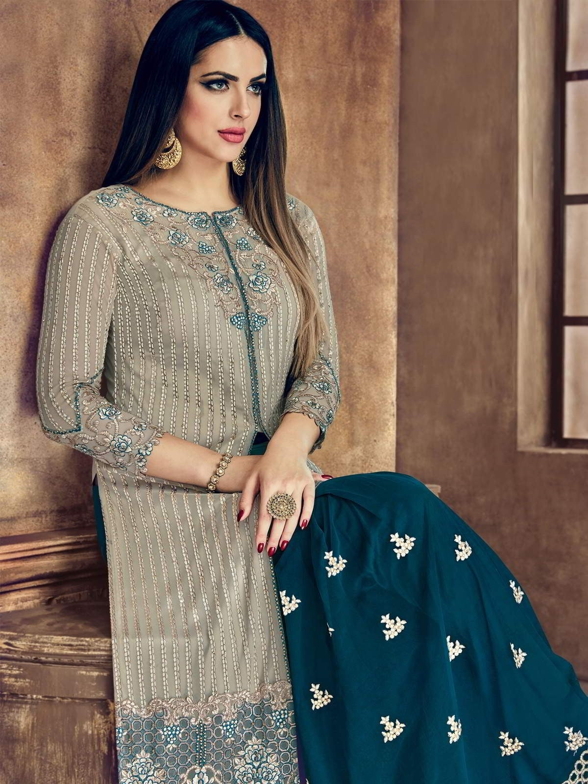 Grey And Turquoise Embroidered Flared Palazzo Suit shows combination of embossed zari and thread embedded designer embroidery on heavy net fabric top with minimalist detail paired with designer net and japan satin palazzo pants and lining and classic bordered chiffon dupatta. Alluring beauty of this dress will make you look classy and stylish when styled with stilettos and clutch.
