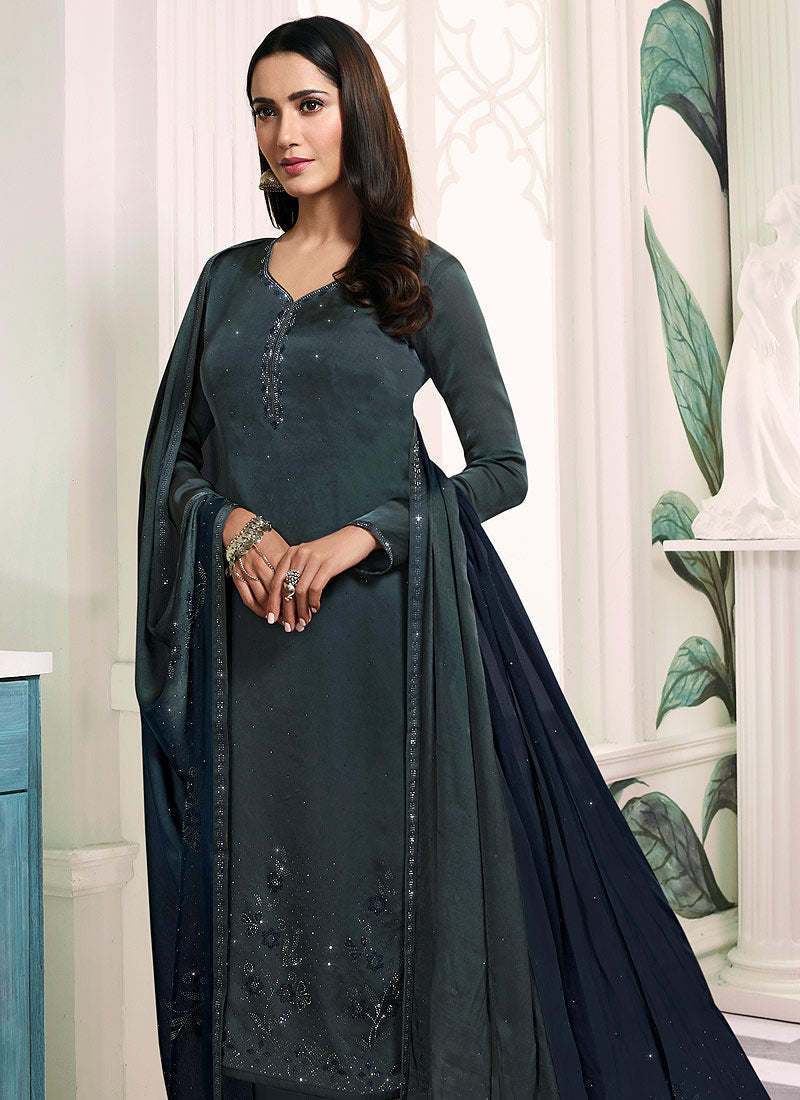 Grey Embroidered Salwar Kameez Suit festures indian salwar kameez with elegant and stylish look for indian weddings. This set has all the traditional hues of stone work done with colourful crystals on its pure satin georgette top paired with santoon bottom and inner. The unique part is it’s shaded crystal embellished satin silk dupatta. Wear this with a pair of heels and traditional jewellery to have a desi girl look.
