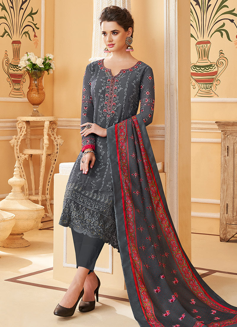 Grey Designer Pant Suit In usa uk canada. Shop Latest Indian Clothes Collection Of Grey Designer Pant Suit Online In Australia, Newzeland. This set has all the traditional hues of hand work done with multi colour thread embroidery on its faux georgette top paired with santoon bottom and inner. The unique part is it’s digital printed muslin dupatta. Wear this with a pair of heels and traditional jewellery to have a desi girl look.
