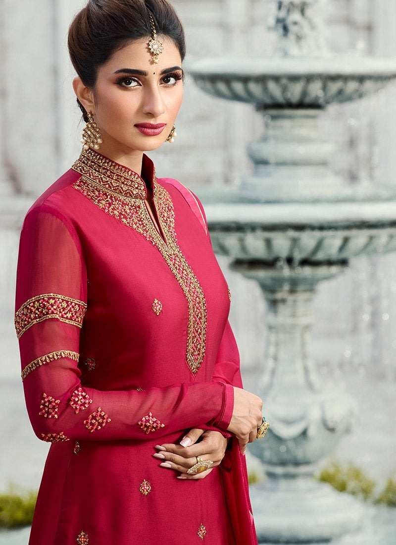 Hot Pink Embroidered Georgette Palazzo Suit will mesmerise rest of the crowd with your ethereal ethnic glow by wearing this set with beautiful top fully embellished with zari buttis and resham kari embroidery work on satin georgette fabric paired with designer embroidered georgette flared gharara bottom with added santoon lining and zari lace and satin detailed net dupatta. This set can be teamed up with a pair of golden heels and traditional jhumkas.
