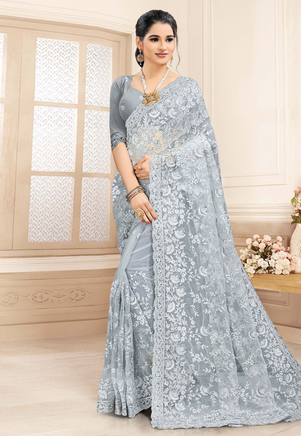 Ice Blue Embroidered Party Wear Saree In usa uk canada Shop Latest Indian Net Saree Collection Of Ice Blue Embroidered Party Wear Saree Online In Australia, Newzeland indian wear with elegance and vibrant appealing with all the hues of multi embroidery work that has modern touch embedded perfectly with stone, resham thread, floral embroidered motif details over pallu and daman on soft net saree with matching equally embellished net blouse. Drape this saree on fesitive parties or on wedding event with heels and statement jewellery to look like a diva.