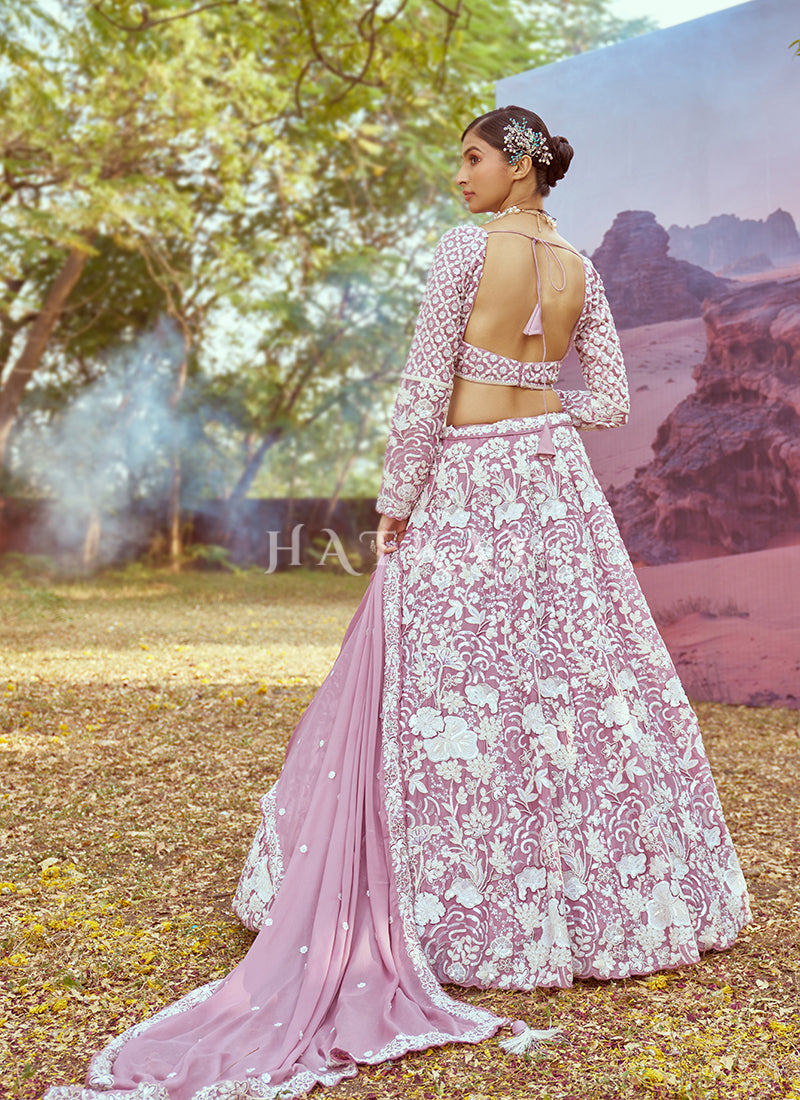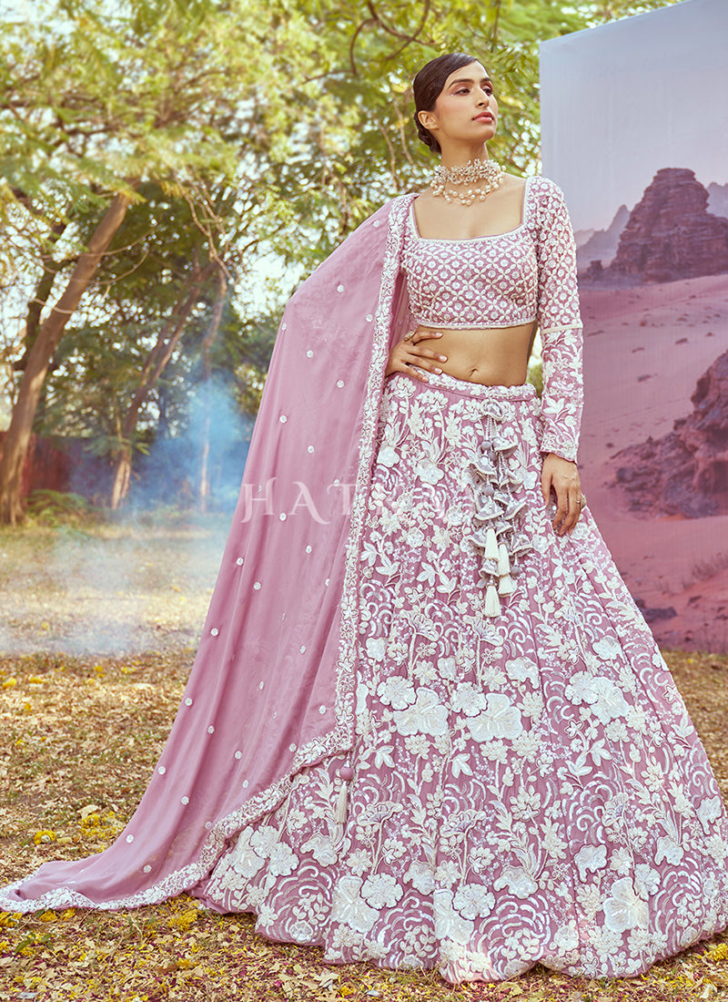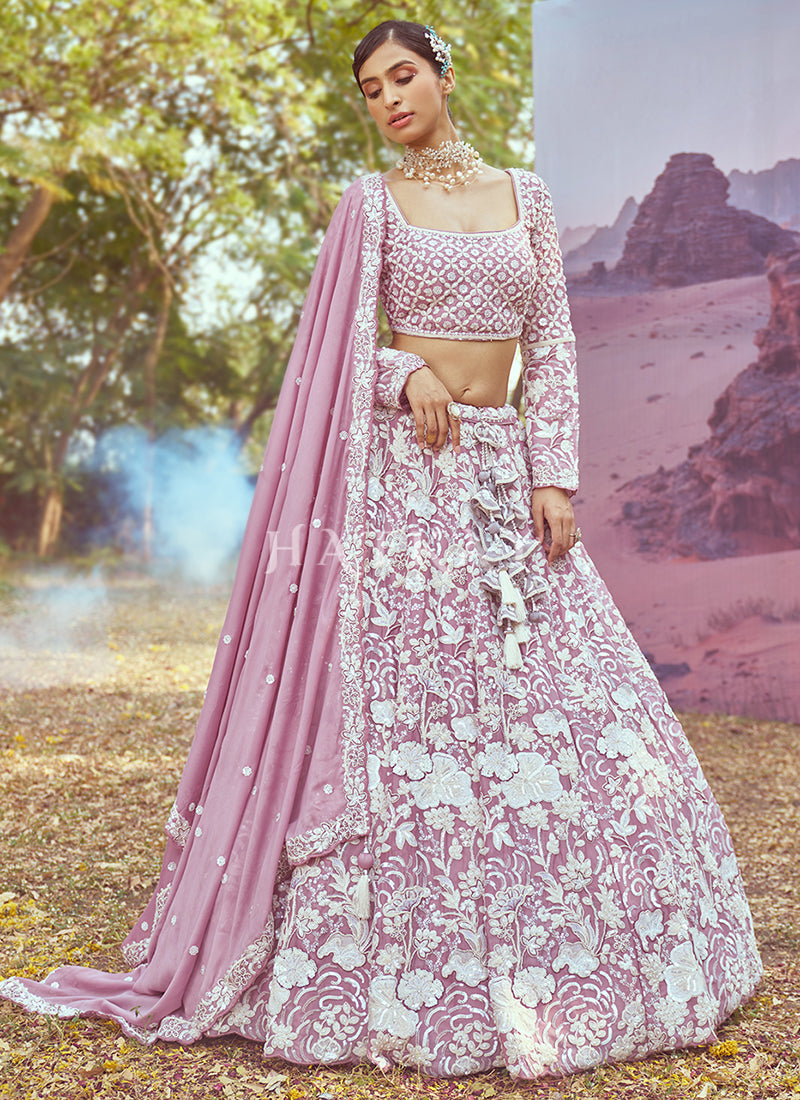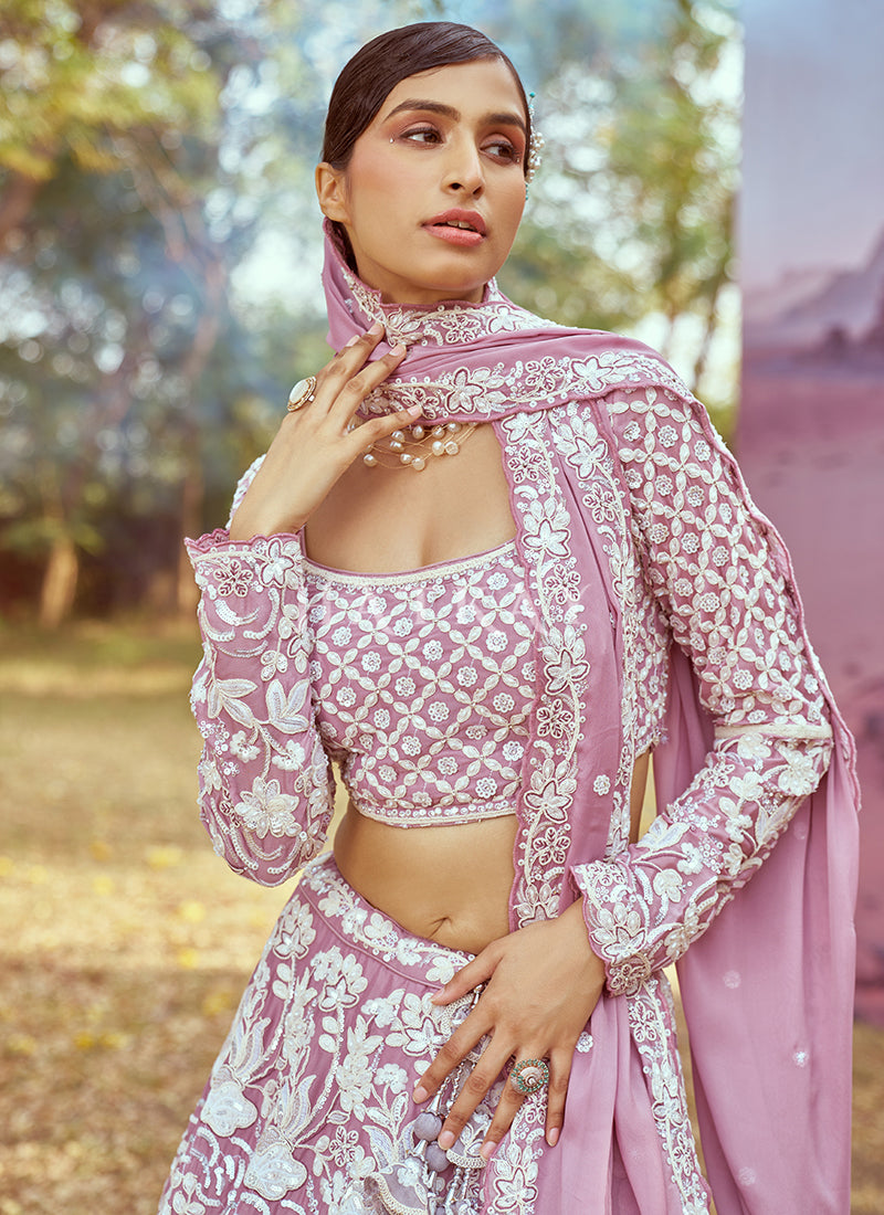 Lavender Embroidery Bridal Lehenga Choli is crafted to make you stand out this wedding season with its vibrant Indian ethnic charm. This luxurious set features resham thread, beads and sequins work on a premium georgette lehenga with heavy latkans and layered satin lining, paired with an equally ornate georgette choli top with satin lining. The elegance of this ensemble is accentuated by its embroidered border and butti work detailed georgette dupatta. Style this set with heels and statement jewelry to shine brightly this wedding season.