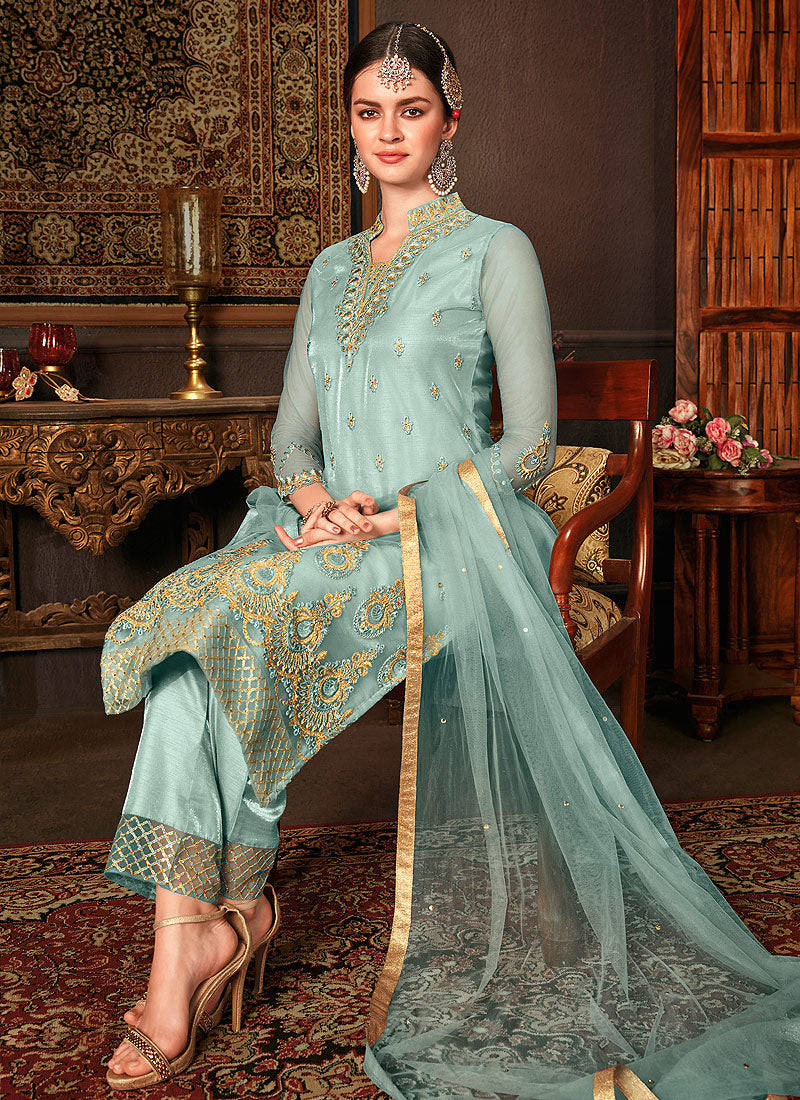 Light Blue Embroidered Pakistani Pants Suit is pakistani style suit with elegant and stylish look to style on wedding events. This set has all the traditional hues of zari, tread and multi embroidery karigiri on its soft net top paired with banarasi silk embroidered pants bottom and inner. The unique part is it’s exclusive satin bordered net dupatta. Wear this with a pair of heels and golden jewellery to have a desi girl look.