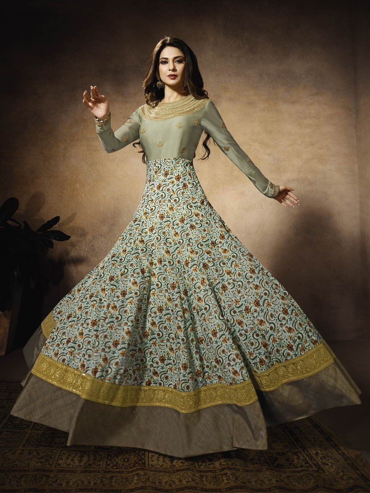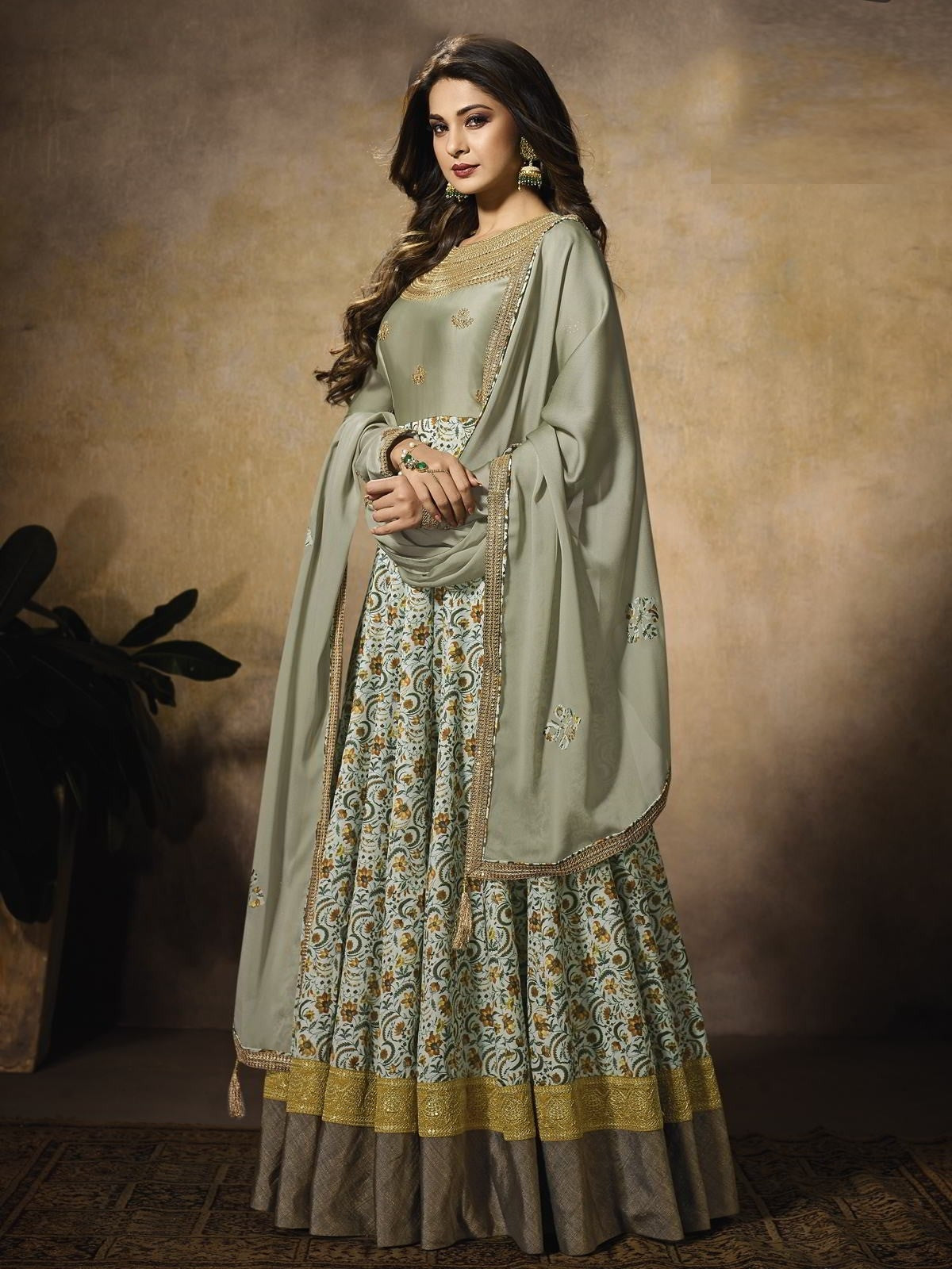 Light Green Embroidered Georgette Anarkali Suit is specifically designed to make you look perfect as a bride and bridesmaids. This suit set features thread, zari and stone neckline embroidered detail on fancy silk and floral satin georgette top paired with shimmering santoon bottom and embroidered chiffon dupatta. Team this suit with stilettos and statement jewellery to complete your look.
