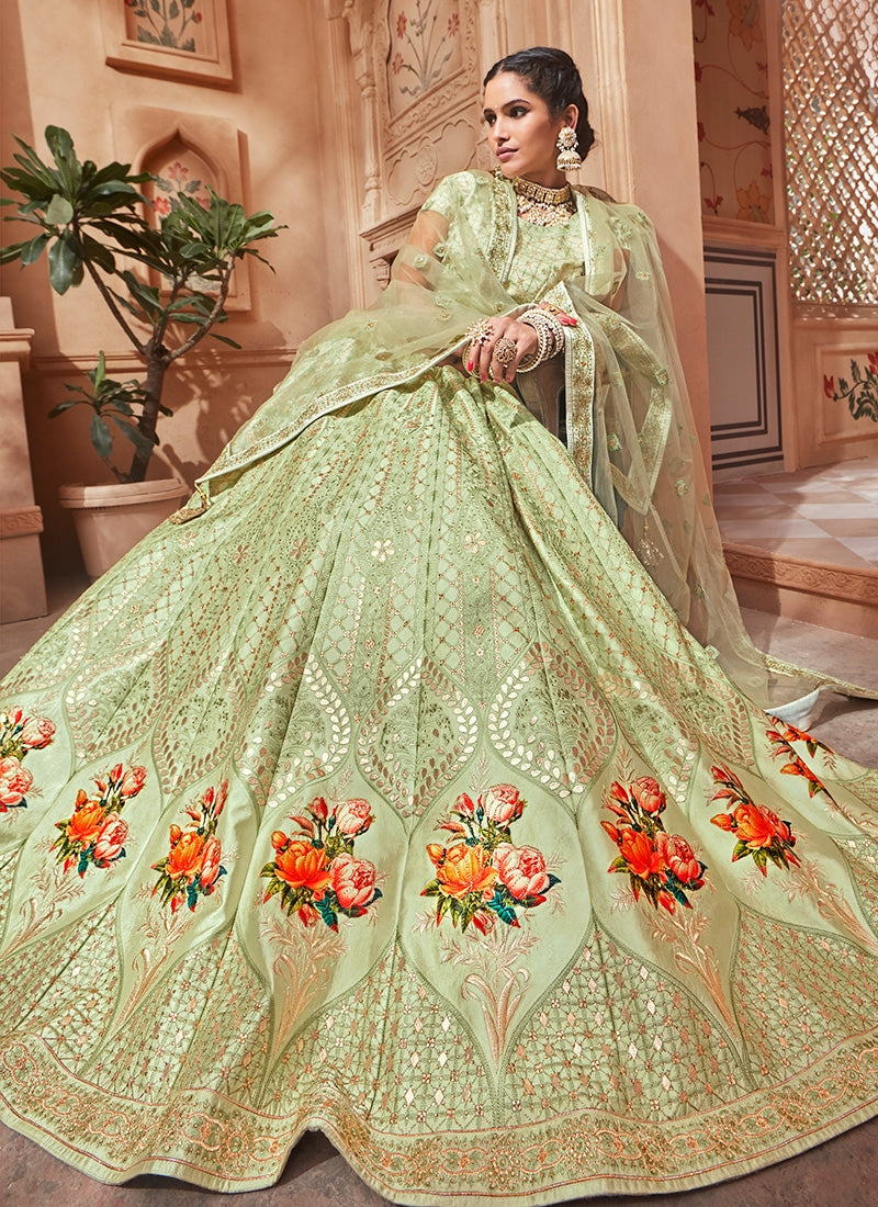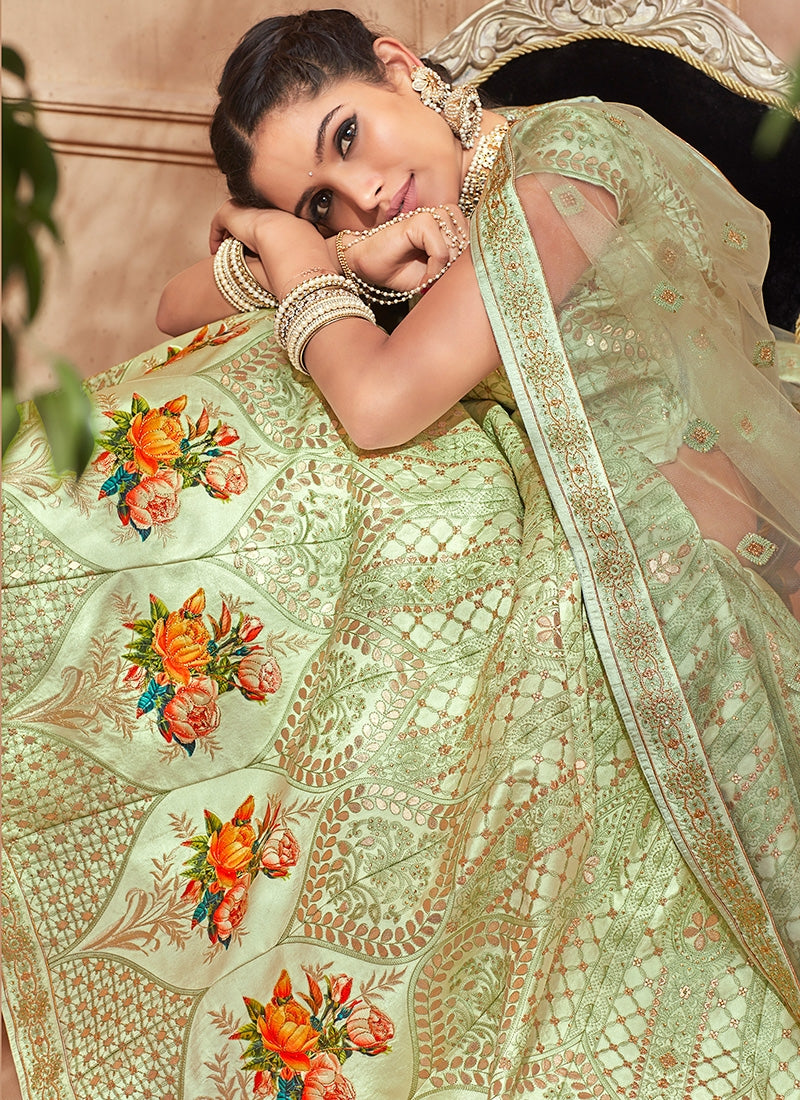Light Green With Butta Embroidered Flared Lehenga Choli Set is feminine, appealing and excellent pick for this Diwali festival or on any wedding function. This elegant set has a very pretty lucknowi and gota patti detail embroidered flared satin silk lehenga paired with equally embellished matching satin choli and fascinating net dupatta. Team this beautiful attire with classic pair of heels and matching jewellery to look like a diva.