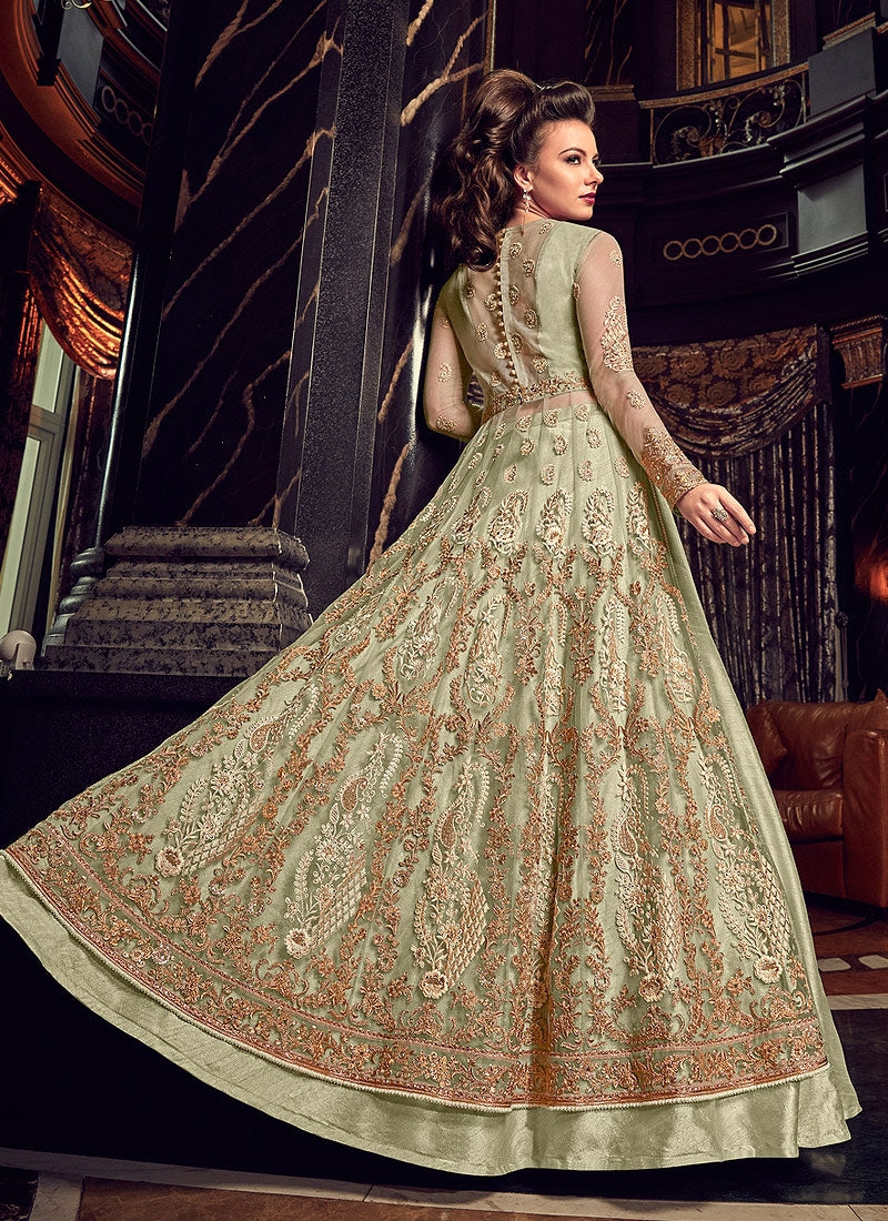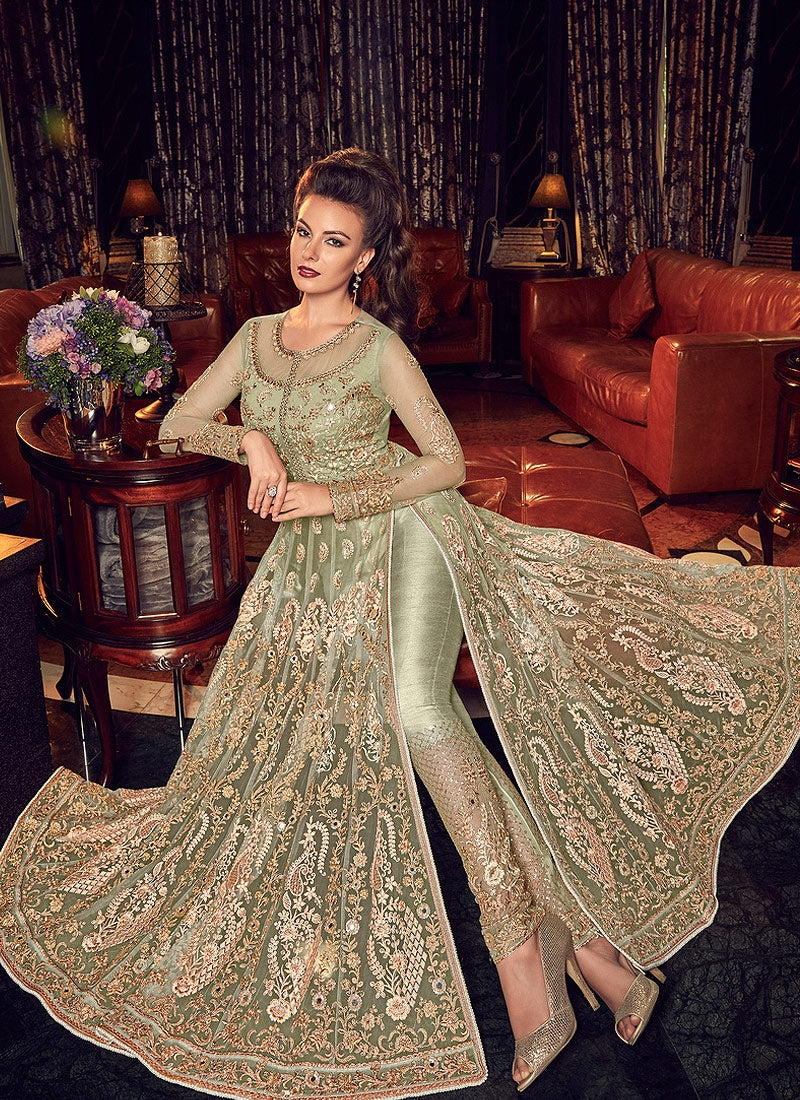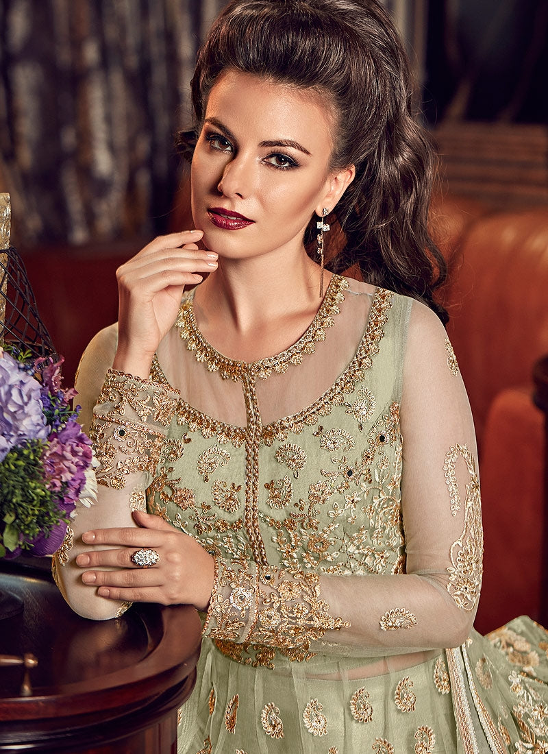 Light Green With Gold Embroidered Lehenga/Pant Suit features embroidery work with minimalist modern art detail annotated beautifully with the combination of resham zari, thread and stone work on its flared anarkali net top paired with matching bangalori silk lehenga/pant bottom and inner and border detailed net bordered dupatta. Style this very pretty attire on any wedding or festival party with heels and jewellery to look stunningly beautiful from the rest of the crowd.