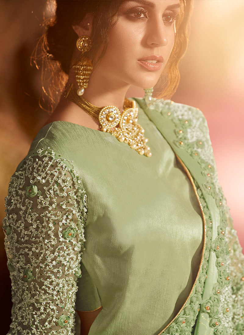 Light Green With Multi Embroidered Pallu Traditional Saree has elegance and vibrant appealing with all the hues of multi embroidery work that has traditional touch embedded perfectly with zari, resham and stone embroidery motifs over pallu and daman on pure georgette silk saree with matching equally embellished dhupion silk blouse. Drape this saree on fesitive parties or on wedding event with heels and jewellery to look like a diva.
