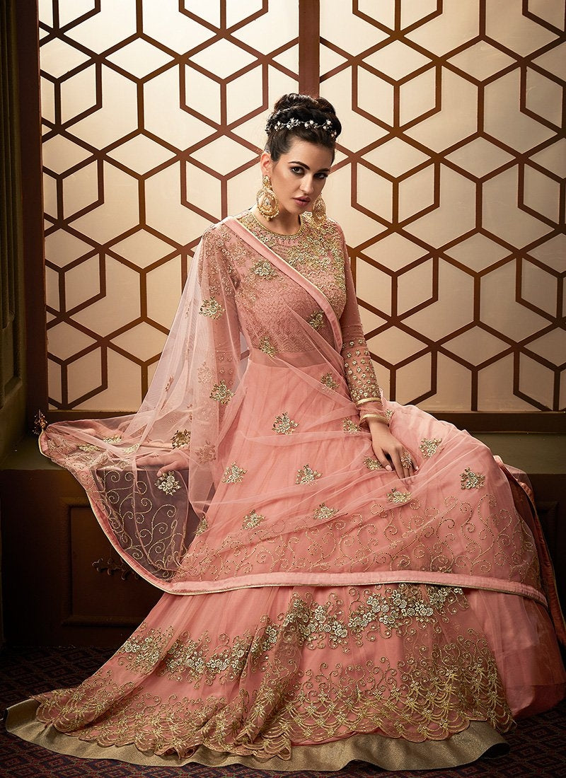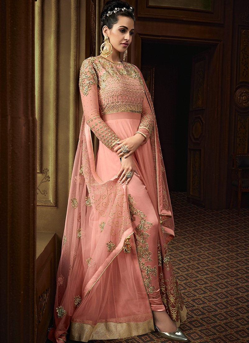 Light Pink Embroidered Net Anarkali Pant Suit is designed with absolute perfection to rock any festive occasion or wedding parties. This set features intricately embossed embroidery work with zari, thread and stone detail on it satin georgette anarkali top paired with santoon bottom and lining and zari embellished net dupatta. This designer set will surely fetch you compliments for you glamorous sense of style. Team it up with statement jewellery and fancy clutch to look mesmerising.