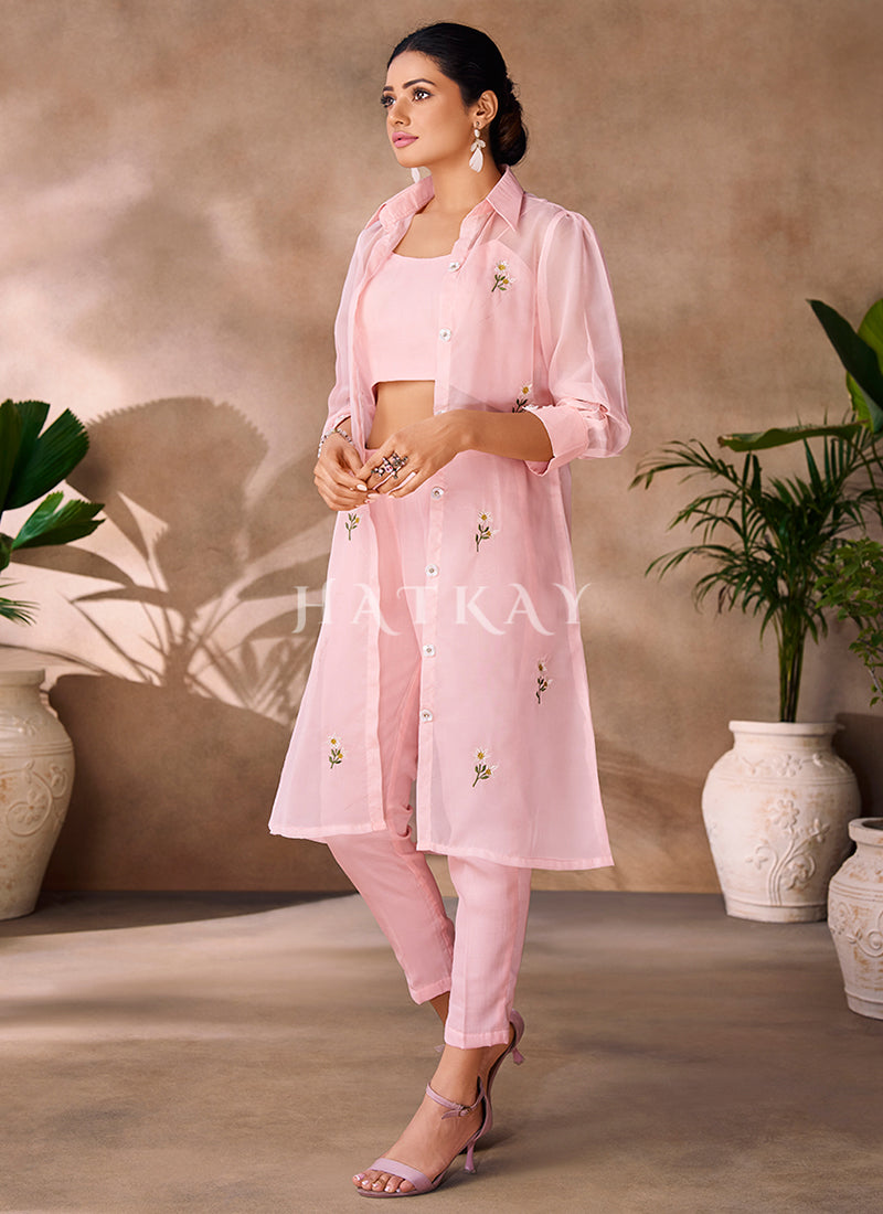 Light Pink Embroidery Organza Co-Ord Set features an indo- western attire with traditional touch. This set is crafted perfectly on premium organza silk fabric cropped inner paired with handwork embroidery enhanced with resham thread, sequins and beads work on premium organza silk jacket and straight fit trouser. Style this very pretty attire on party events or festivals with heels and statement jewellery to look stunningly beautiful.
