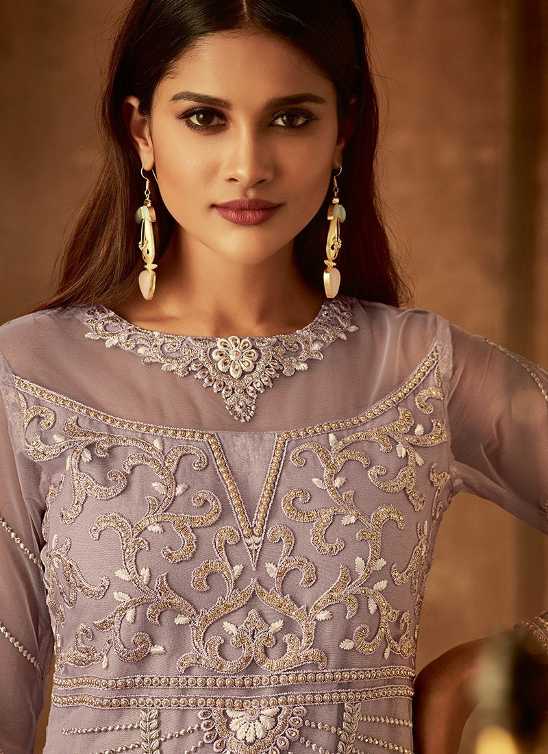 Light Purple Traditional Embroidered Palazzo Pant Suit features very intrinsic designer embroidery with zari stone and pearl detailoover its net top paired with matching ghera embroidered satin silk palazzo bottom and bordered net dupatta. The dress accompanies with matching heavy satin lining silk for top. Wear this to bright up your wedding parties or any social event with heels and jewellery to look best from rest of the crowd.