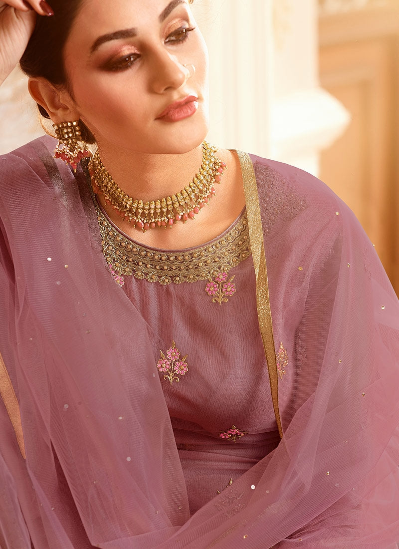 Light Purple With Golden Touch Embroidered Gharara Suit features very intrinsic designer embroidery over its soft net top paired with matching layered ghera embroidered georgette gharara bottom and bordered net dupatta. The dress accompanies with matching heavy japan satin lining for top and bottom. Wear this to bright up your wedding parties or any social event with heels and jewellery to look best from rest of the crowd.