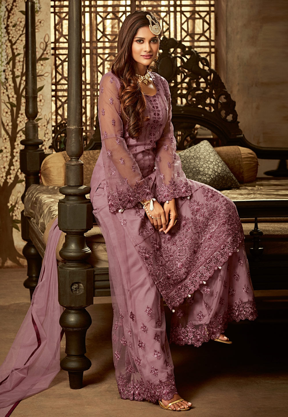 Lilac Purple Embroidered Palazzo Suit is feminine, appealing and excellent pick for any festival and on wedding function. This elegant set comprises a soft net with santoon lining kurta with all over embroidery detailed with minimal motifs of zari, thread and pearl work, a pair of net and santoon embellished palazzo bottom and net bordered dupatta. Team this suit with beige heels and matching accessories to have a graceful look.