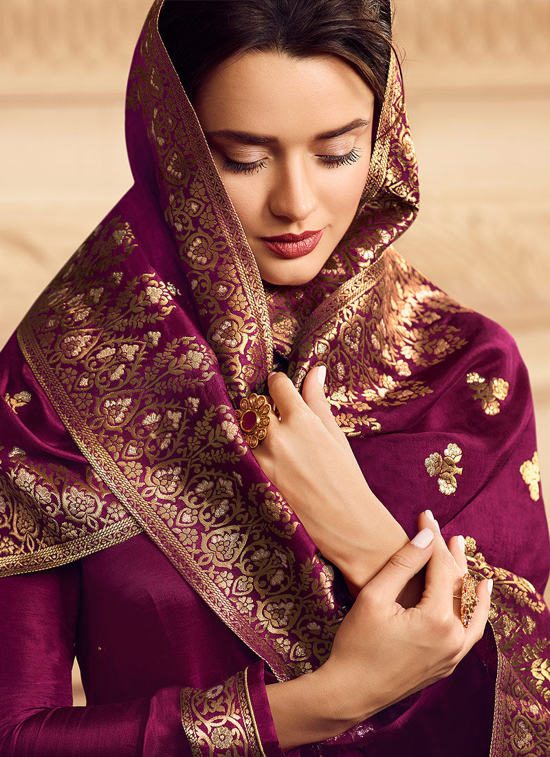 Magenta Golden Embroidered Designer Palazzo Suit festures palazzos pant suit with elegant and stylish look for indian weddings. This set has all the traditional hues of zari work on its viscose jacquard top paired with equally embellished viscose santoon bottom. The unique part is it’s golden zari embellished bordered jacquard silk dupatta. Wear this with a pair of heels and golden jewellery to have a desi girl look.