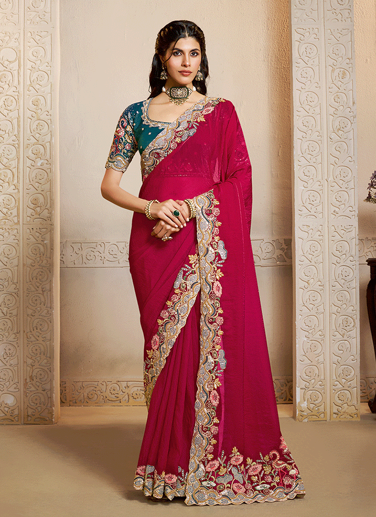Magenta Handwork Embroidery Festive Saree And Blouse