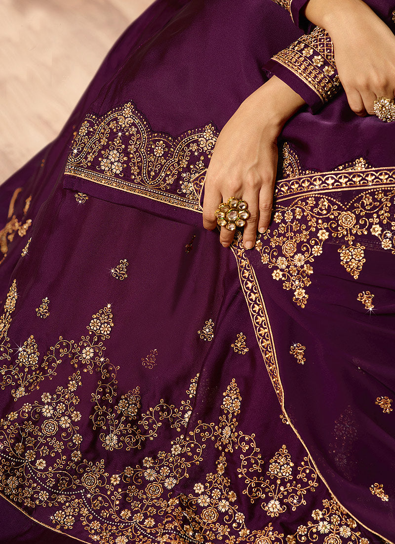 Magenta Wedding Lehenga Suit is a steal the deal outfit showcasing glamorous style and ethnic elegance with its unique embroidered combination of zari, resham and stone work annotated perfectly on straight cut satin georgette top paired with flared georgette with satin lining embellished lehengha bottoms. This set also accompanies embroidery detailed georgette dupatta. Style it gracefully with golden jewellery and stylish heels.
