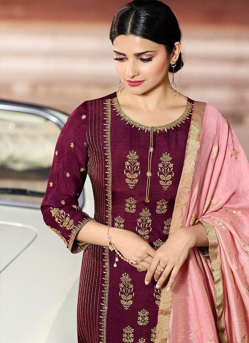 Maroon And Pink Pakistani Pant Suit shows combination of embossed zari and thread detailed embroidery on heavy georgette satin top paired with fancy santoon pants bottom and lining and classic digital golden zari embellished silk dupatta. Alluring beauty of this dress will make you look classy and stylish when styled with stilettos and clutch.