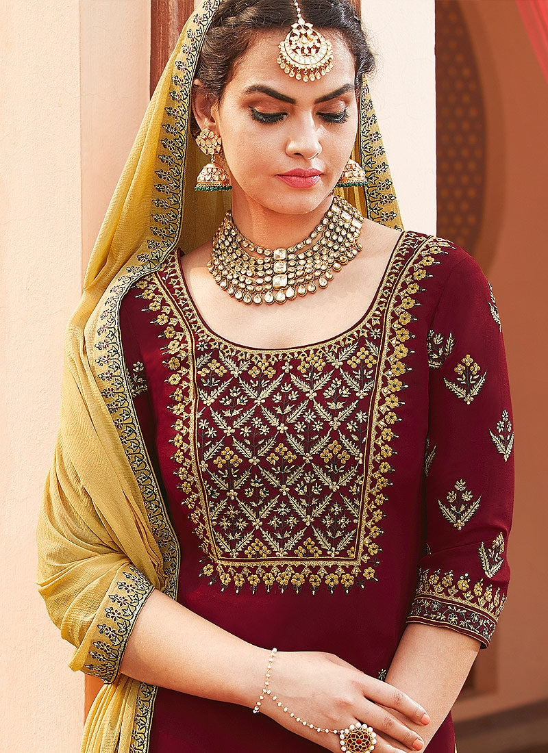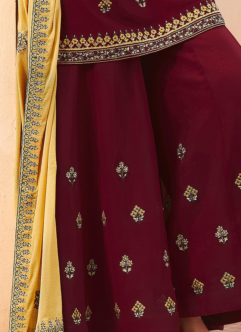 Maroon And Yellow Embroidered Palazzo Suit features very intrinsic designer embroidery over its georgette top paired with matching layered ghera embroidered georgette palazzo bottom and bordered chiffons dupatta. The dress accompanies with matching heavy santoon lining for top and bottom. Wear this to bright up your wedding parties or any social event with heels and jewellery to look best from rest of the crowd.