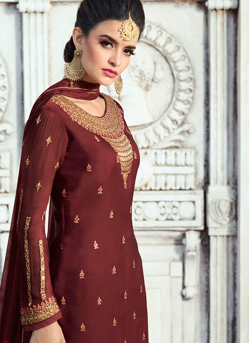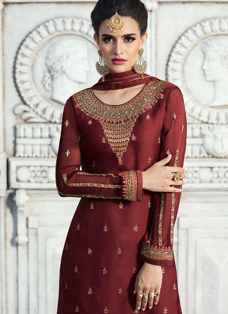 Maroon Embroidered Georgette Palazzo Suit will mesmerise rest of the crowd with your ethereal ethnic glow by wearing this set with beautiful top fully embellished with zari buttis and resham kari embroidery work on satin georgette fabric paired with designer embroidered georgette flared gharara bottom with added santoon lining and zari lace and satin detailed net dupatta. This set can be teamed up with a pair of golden heels and traditional jhumkas.