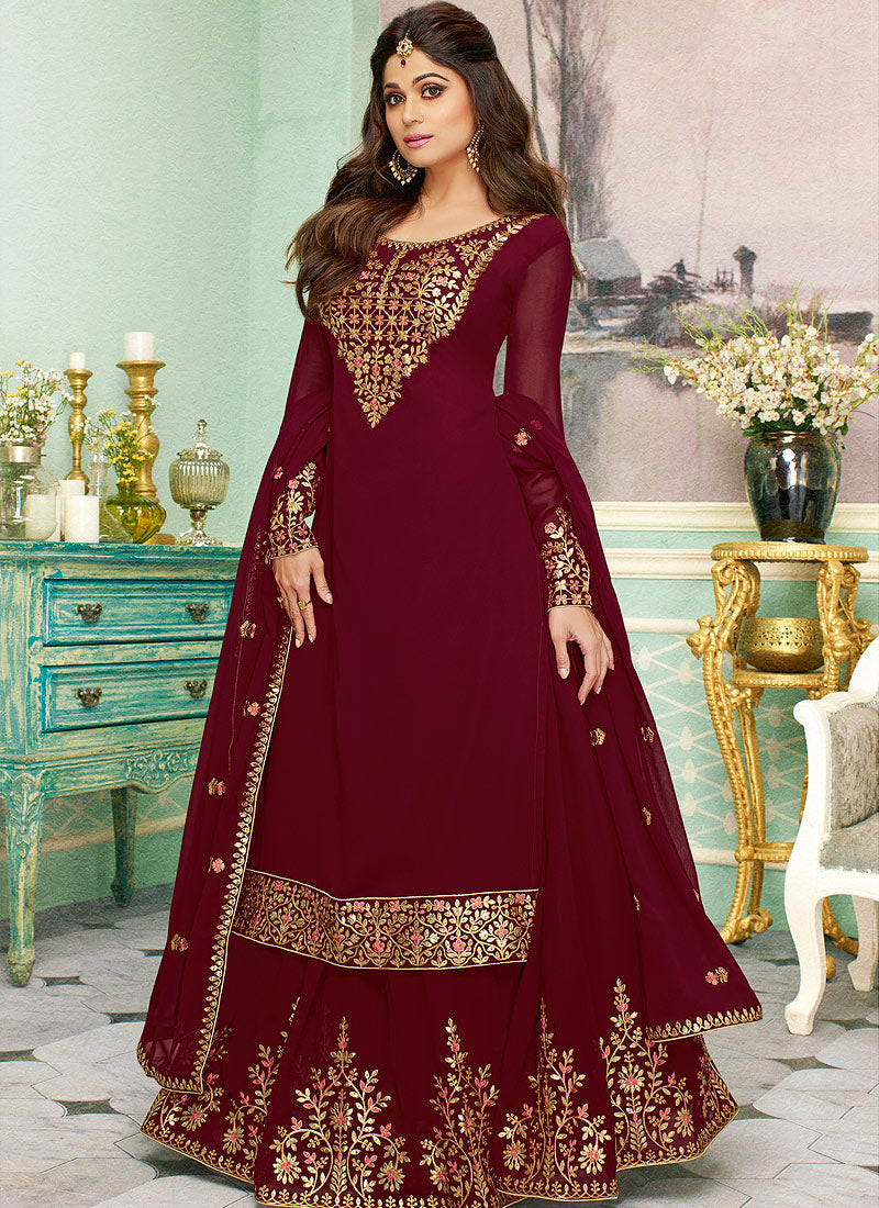 Maroon Golden Embroidered Sharara Style Suit is especially crafted for showcasing glamorous style and ethnic elegance with its unique embroidered combination of beautiful resham zari, thread and stone crystal work annotated perfectly on straight cut georgette top with over all detail. This set accompanies with embellished georgette sharara skirt bottom and embroidered georgette dupatta. Style it with golden earrings and stylish heels on this festive season.