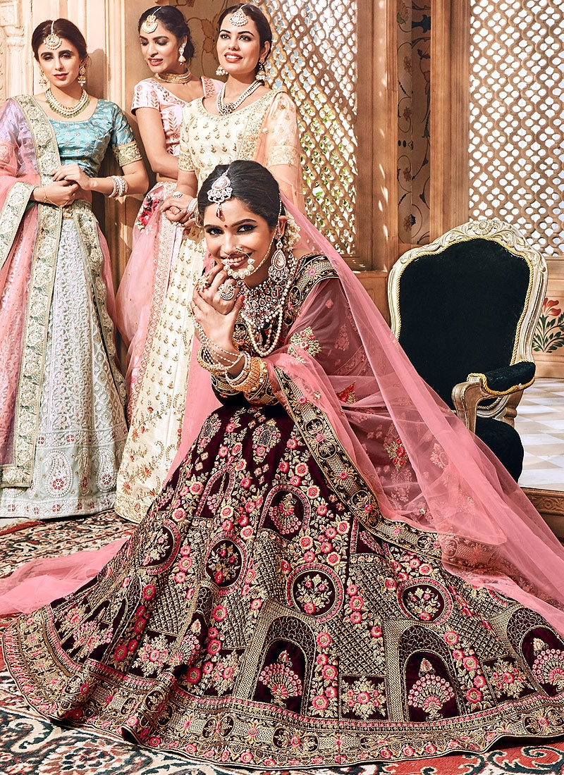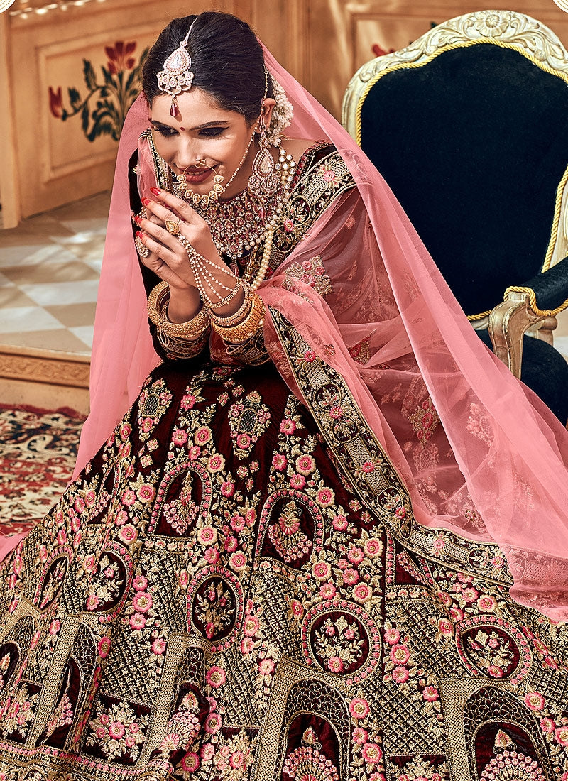 Maroon With Pink Velvet Hand Embroidered Lehenga Choli